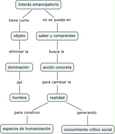 Este mapa conceptual tiene información relacionada a: Interes_Emancipatorio, dominación del hombre, Interés emancipatorio tiene como objeto, acción concreta para cambiar la realidad, realidad generando conocimiento crítico social, saber y comprender busca la acción concreta, objeto eliminar la dominación, realidad para construir espacios de humanización, Interés emancipatorio no se queda en saber y comprender