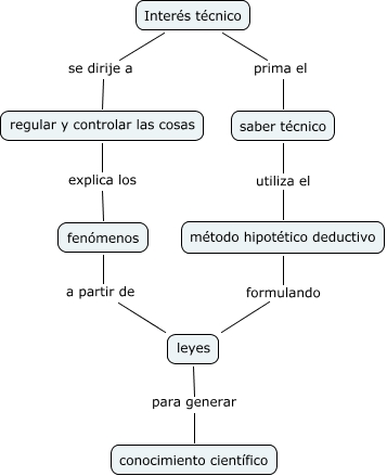 Este mapa conceptual tiene información relacionada a: Interes_Tecnico, Interés técnico se dirije a regular y controlar las cosas, leyes para generar conocimiento científico, regular y controlar las cosas explica los fenómenos, Interés técnico prima el saber técnico, fenómenos a partir de leyes, saber técnico utiliza el método hipotético deductivo, método hipotético deductivo formulando leyes