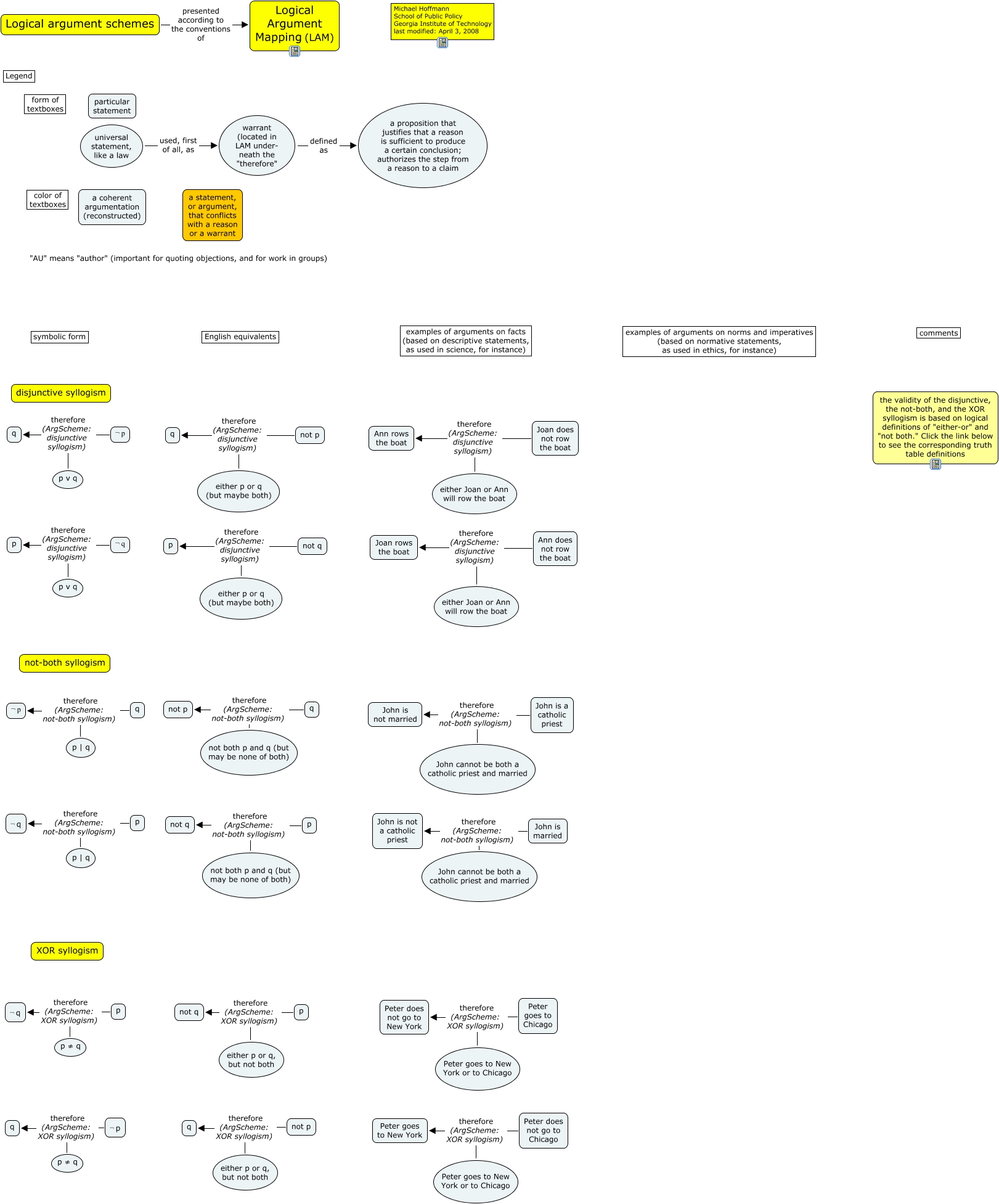 This Concept Map, created with IHMC CmapTools, has information related to: disjunctive, either p or q, but not both therefore (ArgScheme: XOR syllogism) q, either Joan or Ann will row the boat therefore (ArgScheme: disjunctive syllogism) Ann does not row the boat, either p or q, but not both therefore (ArgScheme: XOR syllogism) not p, ¬ p therefore (ArgScheme: disjunctive syllogism) q, John cannot be both a catholic priest and married therefore (ArgScheme: not-both syllogism) John is not a catholic priest, Peter goes to New York or to Chicago therefore (ArgScheme: XOR syllogism) Peter goes to New York, John cannot be both a catholic priest and married therefore (ArgScheme: not-both syllogism) John is married, Peter does not go to Chicago therefore (ArgScheme: XOR syllogism) Peter goes to New York, John cannot be both a catholic priest and married therefore (ArgScheme: not-both syllogism) John is a catholic priest, p v q therefore (ArgScheme: disjunctive syllogism) q, Peter goes to New York or to Chicago therefore (ArgScheme: XOR syllogism) Peter goes to Chicago, p therefore (ArgScheme: not-both syllogism) ¬ q, p | q therefore (ArgScheme: not-both syllogism) ¬ q, either Joan or Ann will row the boat therefore (ArgScheme: disjunctive syllogism) Ann rows the boat, not both p and q (but may be none of both) therefore (ArgScheme: not-both syllogism) not q, warrant (located in LAM under- neath the "therefore" defined as a proposition that justifies that a reason is sufficient to produce a certain conclusion; authorizes the step from a reason to a claim, not both p and q (but may be none of both) therefore (ArgScheme: not-both syllogism) not p, either Joan or Ann will row the boat therefore (ArgScheme: disjunctive syllogism) Joan rows the boat, John cannot be both a catholic priest and married therefore (ArgScheme: not-both syllogism) John is not married, not p therefore (ArgScheme: disjunctive syllogism) q