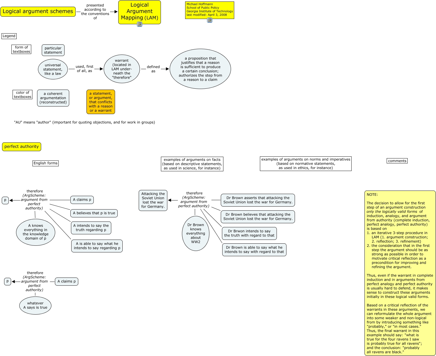 This Concept Map, created with IHMC CmapTools, has information related to: perfect authority, warrant (located in LAM under- neath the "therefore" defined as a proposition that justifies that a reason is sufficient to produce a certain conclusion; authorizes the step from a reason to a claim, A claims p therefore (ArgScheme: argument from perfect authority) p, A intends to say the truth regarding p therefore (ArgScheme: argument from perfect authority) p, A knows everything in the knowledge domain of p therefore (ArgScheme: argument from perfect authority) p, A believes that p is true therefore (ArgScheme: argument from perfect authority) p, A is able to say what he intends to say regarding p therefore (ArgScheme: argument from perfect authority) p, Dr Brwon intends to say the truth with regard to that therefore (ArgScheme: argument from perfect authority) Attacking the Soviet Union lost the war for Germany., Dr Brown believes that attacking the Soviet Union lost the war for Germany. therefore (ArgScheme: argument from perfect authority) Attacking the Soviet Union lost the war for Germany., A claims p therefore (ArgScheme: argument from perfect authority) p, Dr Brown knows everything about WW2 therefore (ArgScheme: argument from perfect authority) Attacking the Soviet Union lost the war for Germany., Logical argument schemes presented according to the conventions of Logical Argument Mapping (LAM), Dr Brown is able to say what he intends to say with regard to that therefore (ArgScheme: argument from perfect authority) Attacking the Soviet Union lost the war for Germany., universal statement, like a law used, first of all, as warrant (located in LAM under- neath the "therefore", whatever A says is true therefore (ArgScheme: argument from perfect authority) p, Dr Brown asserts that attacking the Soviet Union lost the war for Germany. therefore (ArgScheme: argument from perfect authority) Attacking the Soviet Union lost the war for Germany.