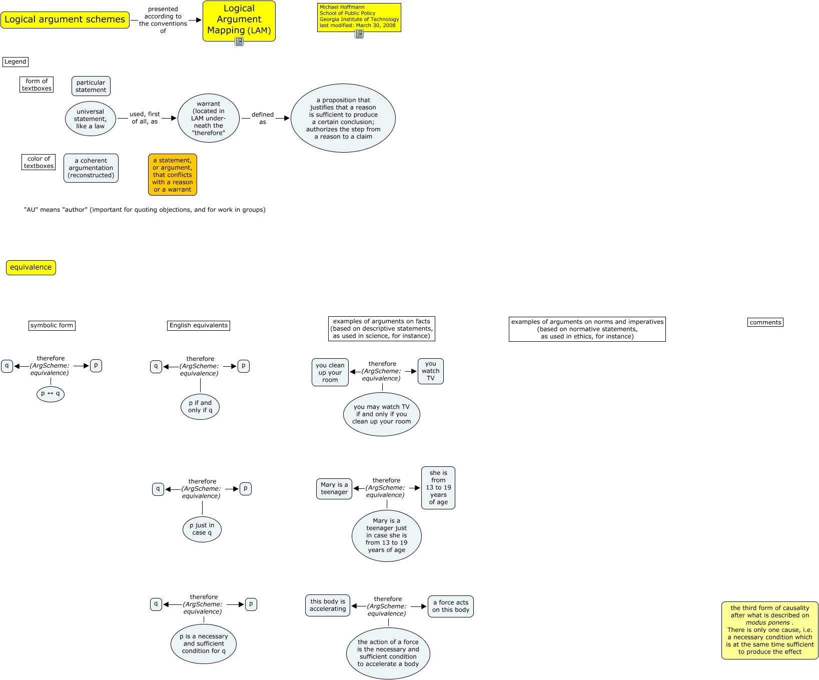 This Concept Map, created with IHMC CmapTools, has information related to: equivalence, warrant (located in LAM under- neath the "therefore" defined as a proposition that justifies that a reason is sufficient to produce a certain conclusion; authorizes the step from a reason to a claim, universal statement, like a law used, first of all, as warrant (located in LAM under- neath the "therefore", p is a necessary and sufficient condition for q therefore (ArgScheme: equivalence) p, Mary is a teenager just in case she is from 13 to 19 years of age therefore (ArgScheme: equivalence) Mary is a teenager, you may watch TV if and only if you clean up your room therefore (ArgScheme: equivalence) you clean up your room, p just in case q therefore (ArgScheme: equivalence) p, p is a necessary and sufficient condition for q therefore (ArgScheme: equivalence) q, the action of a force is the necessary and sufficient condition to accelerate a body therefore (ArgScheme: equivalence) this body is accelerating, Logical argument schemes presented according to the conventions of Logical Argument Mapping (LAM), p if and only if q therefore (ArgScheme: equivalence) q, the action of a force is the necessary and sufficient condition to accelerate a body therefore (ArgScheme: equivalence) a force acts on this body, p if and only if q therefore (ArgScheme: equivalence) p, Mary is a teenager just in case she is from 13 to 19 years of age therefore (ArgScheme: equivalence) she is from 13 to 19 years of age, you may watch TV if and only if you clean up your room therefore (ArgScheme: equivalence) you watch TV, p just in case q therefore (ArgScheme: equivalence) q, p ↔ q therefore (ArgScheme: equivalence) p, p ↔ q therefore (ArgScheme: equivalence) q