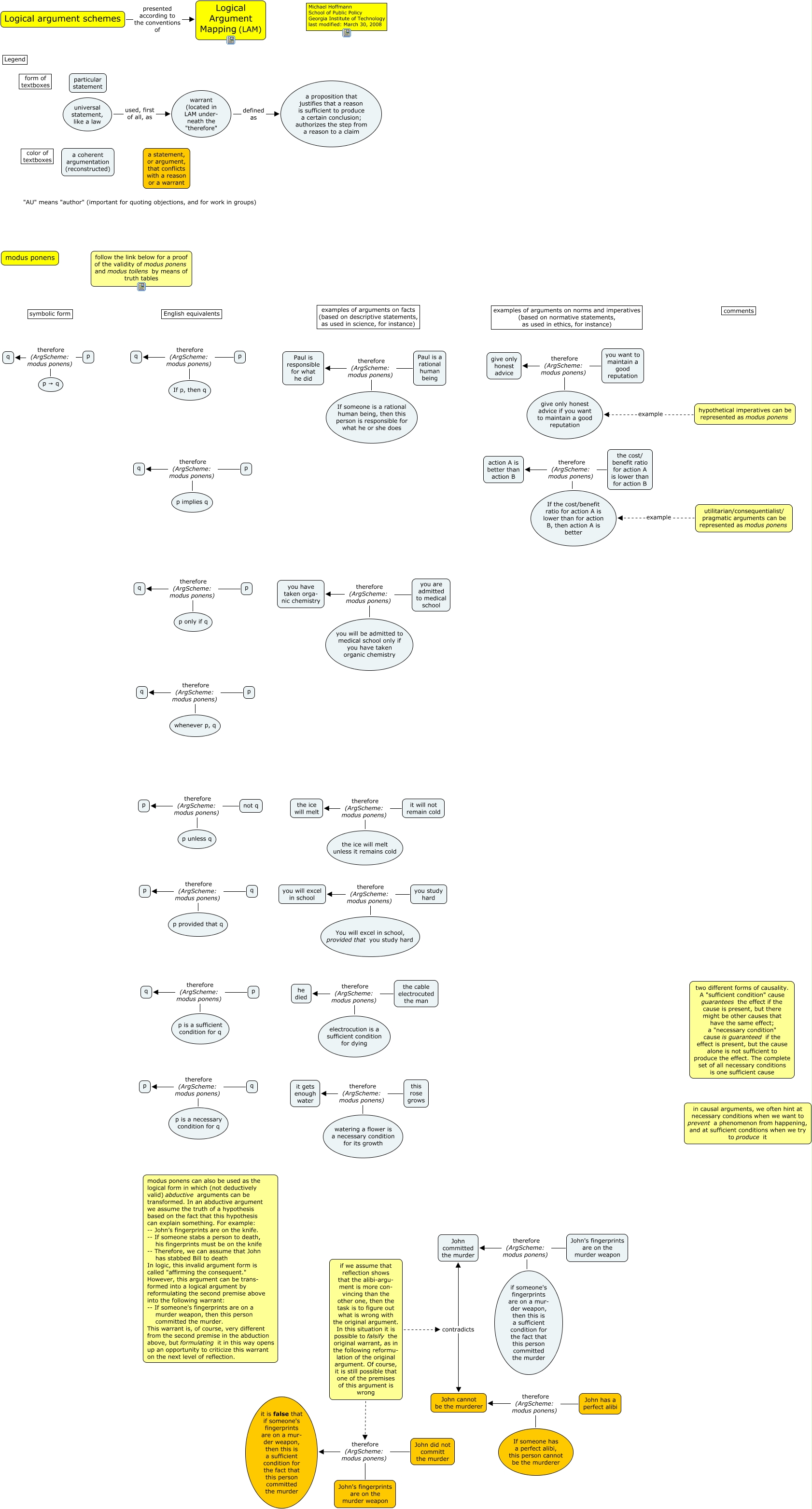 This Concept Map, created with IHMC CmapTools, has information related to: modus ponens, John has a perfect alibi therefore (ArgScheme: modus ponens) John cannot be the murderer, if we assume that reflection shows that the alibi-argu- ment is more con- vincing than the other one, then the task is to figure out what is wrong with the original argument. In this situation it is possible to falsify the original warrant, as in the following reformu- lation of the original argument. Of course, it is still possible that one of the premises of this argument is wrong contradicts John committed the murder, not q therefore (ArgScheme: modus ponens) p, you want to maintain a good reputation therefore (ArgScheme: modus ponens) give only honest advice, p → q therefore (ArgScheme: modus ponens) q, watering a flower is a necessary condition for its growth therefore (ArgScheme: modus ponens) it gets enough water, John did not committ the murder therefore (ArgScheme: modus ponens) it is false that if someone's fingerprints are on a mur- der weapon, then this is a sufficient condition for the fact that this person committed the murder, you study hard therefore (ArgScheme: modus ponens) you will excel in school, p is a necessary condition for q therefore (ArgScheme: modus ponens) p, If someone has a perfect alibi, this person cannot be the murderer therefore (ArgScheme: modus ponens) John cannot be the murderer, you will be admitted to medical school only if you have taken organic chemistry therefore (ArgScheme: modus ponens) you have taken orga- nic chemistry, the cable electrocuted the man therefore (ArgScheme: modus ponens) he died, p therefore (ArgScheme: modus ponens) q, if we assume that reflection shows that the alibi-argu- ment is more con- vincing than the other one, then the task is to figure out what is wrong with the original argument. In this situation it is possible to falsify the original warrant, as in the following reformu- lation of the original argument. Of course, it is still possible that one of the premises of this argument is wrong contradicts John cannot be the murderer, if we assume that reflection shows that the alibi-argu- ment is more con- vincing than the other one, then the task is to figure out what is wrong with the original argument. In this situation it is possible to falsify the original warrant, as in the following reformu- lation of the original argument. Of course, it is still possible that one of the premises of this argument is wrong therefore (ArgScheme: modus ponens) it is false that if someone's fingerprints are on a mur- der weapon, then this is a sufficient condition for the fact that this person committed the murder, p therefore (ArgScheme: modus ponens) q, electrocution is a sufficient condition for dying therefore (ArgScheme: modus ponens) he died, p therefore (ArgScheme: modus ponens) q, If someone is a rational human being, then this person is responsible for what he or she does therefore (ArgScheme: modus ponens) Paul is responsible for what he did, p therefore (ArgScheme: modus ponens) q