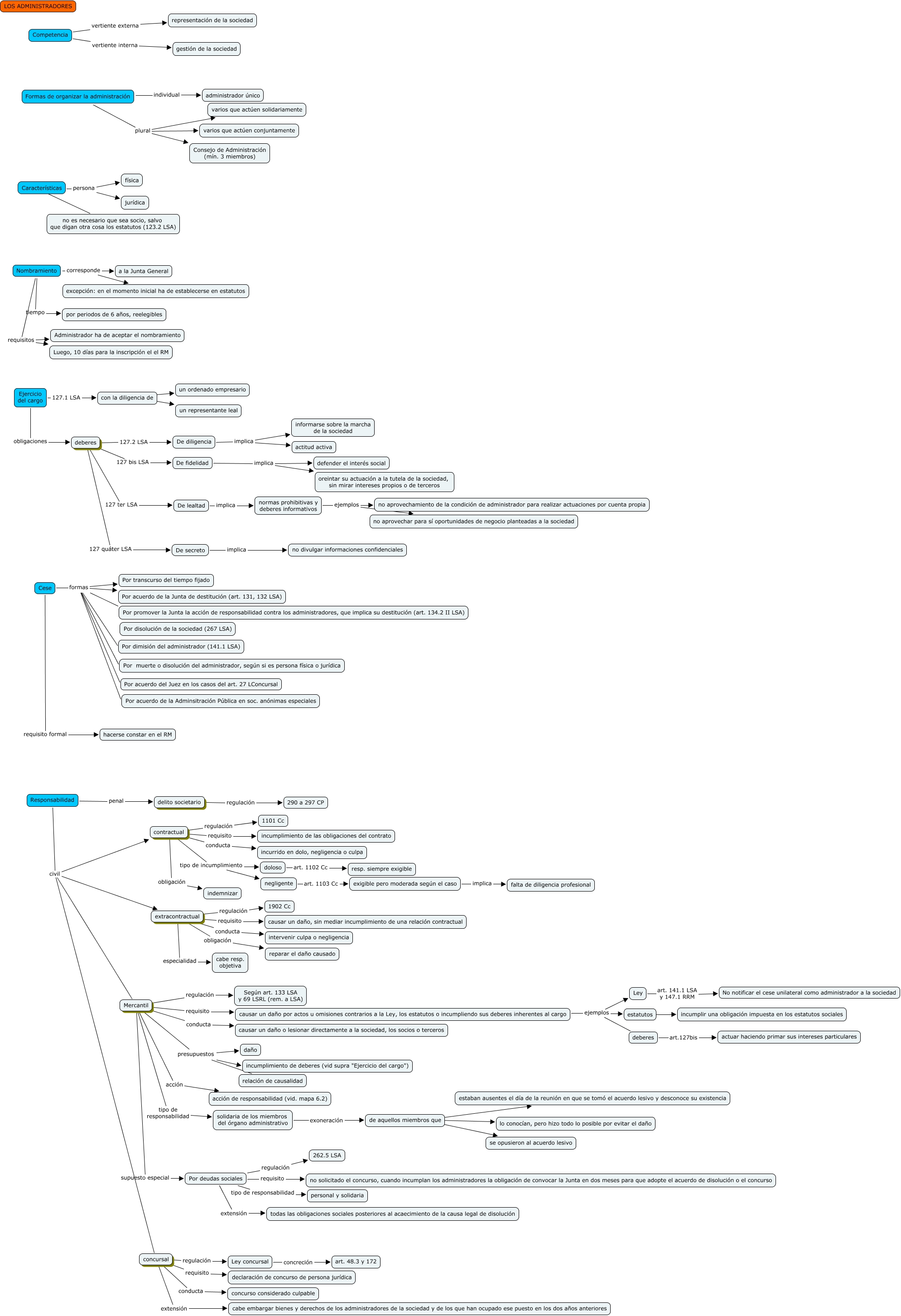 Este Cmap, tiene información relacionada con: caso6, Cese requisito formal hacerse constar en el RM, De diligencia implica actitud activa, Responsabilidad civil extracontractual, exigible pero moderada según el caso implica falta de diligencia profesional, Formas de organizar la administración plural varios que actúen solidariamente, extracontractual especialidad cabe resp. objetiva, De secreto implica no divulgar informaciones confidenciales, Formas de organizar la administración plural Consejo de Administración (mín. 3 miembros), contractual tipo de incumplimiento negligente, concursal requisito declaración de concurso de persona jurídica, Mercantil tipo de responsabilidad solidaria de los miembros del órgano administrativo, Responsabilidad penal delito societario, Mercantil presupuestos incumplimiento de deberes (vid supra "Ejercicio del cargo"), deberes 127.2 LSA De diligencia, Por deudas sociales regulación 262.5 LSA, normas prohibitivas y deberes informativos ejemplos no aprovechar para sí oportunidades de negocio planteadas a la sociedad, Cese formas Por promover la Junta la acción de responsabilidad contra los administradores, que implica su destitución (art. 134.2 II LSA), extracontractual regulación 1902 Cc, deberes art.127bis actuar haciendo primar sus intereses particulares, Mercantil requisito causar un daño por actos u omisiones contrarios a la Ley, los estatutos o incumpliendo sus deberes inherentes al cargo