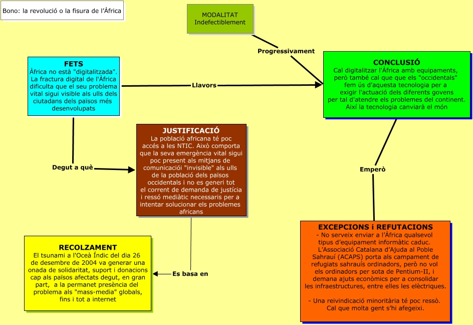 Este Cmap, tiene información relacionada con: Mario Culebras Fil BONO, JUSTIFICACIÓ La població africana té poc accés a les NTIC. Això comporta que la seva emergència vital sigui poc present als mitjans de comunicaciói "invisible" als ulls de la població dels països occidentals i no es generi tot el corrent de demanda de justícia i ressó mediàtic necessaris per a intentar solucionar els problemes africans Es basa en RECOLZAMENT El tsunami a l'Oceà Índic del dia 26 de desembre de 2004 va generar una onada de solidaritat, suport i donacions cap als països afectats degut, en gran part, a la permanet presència del problema als "mass-media" globals, fins i tot a internet, MODALITAT Indefectiblement Progressivament CONCLUSIÓ Cal digitalitzar l'Àfrica amb equipaments, però també cal que que els "occidentals" fem ús d'aquesta tecnologia per a exigir l'actuació dels diferents govens per tal d'atendre els problemes del continent. Així la tecnologia canviarà el món, CONCLUSIÓ Cal digitalitzar l'Àfrica amb equipaments, però també cal que que els "occidentals" fem ús d'aquesta tecnologia per a exigir l'actuació dels diferents govens per tal d'atendre els problemes del continent. Així la tecnologia canviarà el món Emperò EXCEPCIONS i REFUTACIONS - No serveix enviar a l’Àfrica qualsevol tipus d’equipament informàtic caduc. L’Associació Catalana d’Ajuda al Poble Sahrauí (ACAPS) porta als campament de refugiats sahrauís ordinadors, però no vol els ordinadors per sota de Pentium-II, i demana ajuts econòmics per a consolidar les infraestructures, entre elles les elèctriques. - Una reivindicació minoritària té poc ressò. Cal que molta gent s’hi afegeixi., FETS Àfrica no està "digitalitzada". La fractura digital de l'Àfrica dificulta que el seu problema vital sigui visible als ulls dels ciutadans dels països més desenvolupats Llavors CONCLUSIÓ Cal digitalitzar l'Àfrica amb equipaments, però també cal que que els "occidentals" fem ús d'aquesta tecnologia per a exigir l'actuació dels diferents govens per tal d'atendre els problemes del continent. Així la tecnologia canviarà el món, FETS Àfrica no està "digitalitzada". La fractura digital de l'Àfrica dificulta que el seu problema vital sigui visible als ulls dels ciutadans dels països més desenvolupats Degut a què JUSTIFICACIÓ La població africana té poc accés a les NTIC. Això comporta que la seva emergència vital sigui poc present als mitjans de comunicaciói "invisible" als ulls de la població dels països occidentals i no es generi tot el corrent de demanda de justícia i ressó mediàtic necessaris per a intentar solucionar els problemes africans