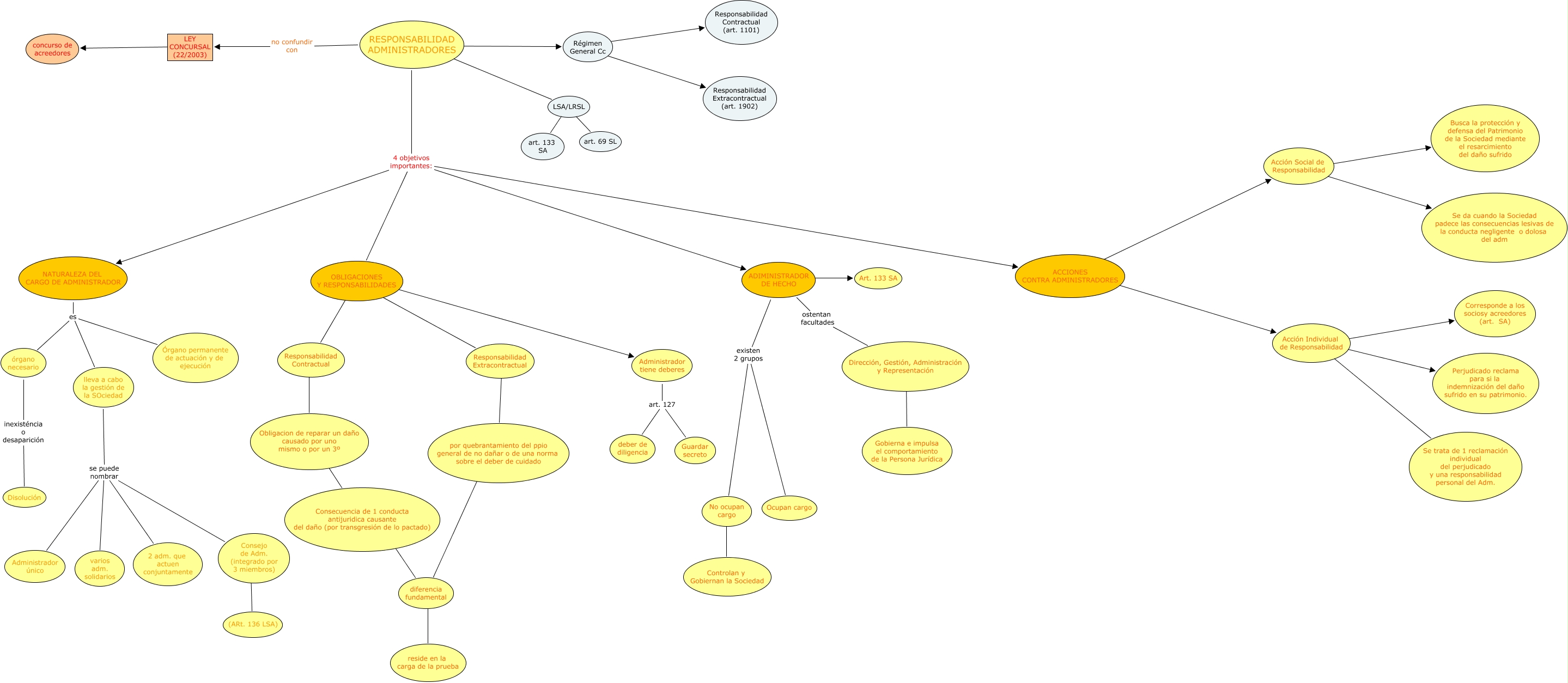 Este Cmap, tiene información relacionada con: Quien da la cara Mapa nº 6, LEY CONCURSAL (22/2003) ???? concurso de acreedores, No ocupan cargo ???? Controlan y Gobiernan la Sociedad, NATURALEZA DEL CARGO DE ADMINISTRADOR es Órgano permanente de actuación y de ejecución, Administrador tiene deberes art. 127 deber de diligencia, Régimen General Cc ???? Responsabilidad Contractual (art. 1101), lleva a cabo la gestión de la SOciedad se puede nombrar 2 adm. que actuen conjuntamente, Dirección, Gestión, Administración y Representación ???? Gobierna e impulsa el comportamiento de la Persona Jurídica, ACCIONES CONTRA ADMINISTRADORES ???? Acción Social de Responsabilidad, ADIMINISTRADOR DE HECHO existen 2 grupos No ocupan cargo, Acción Individual de Responsabilidad ???? Corresponde a los sociosy acreedores (art. SA), Acción Social de Responsabilidad ???? Se da cuando la Sociedad padece las consecuencias lesivas de la conducta negligente o dolosa del adm, OBLIGACIONES Y RESPONSABILIDADES ???? Administrador tiene deberes, Régimen General Cc ???? Responsabilidad Extracontractual (art. 1902), diferencia fundamental ???? reside en la carga de la prueba, RESPONSABILIDAD ADMINISTRADORES 4 objetivos importantes: OBLIGACIONES Y RESPONSABILIDADES, Responsabilidad Extracontractual ???? por quebrantamiento del ppio general de no dañar o de una norma sobre el deber de cuidado, lleva a cabo la gestión de la SOciedad se puede nombrar varios adm. solidarios, Obligacion de reparar un daño causado por uno mismo o por un 3º ???? Consecuencia de 1 conducta antijuridica causante del daño (por transgresión de lo pactado), órgano necesario inexisténcia o desaparición Disolución, NATURALEZA DEL CARGO DE ADMINISTRADOR es lleva a cabo la gestión de la SOciedad