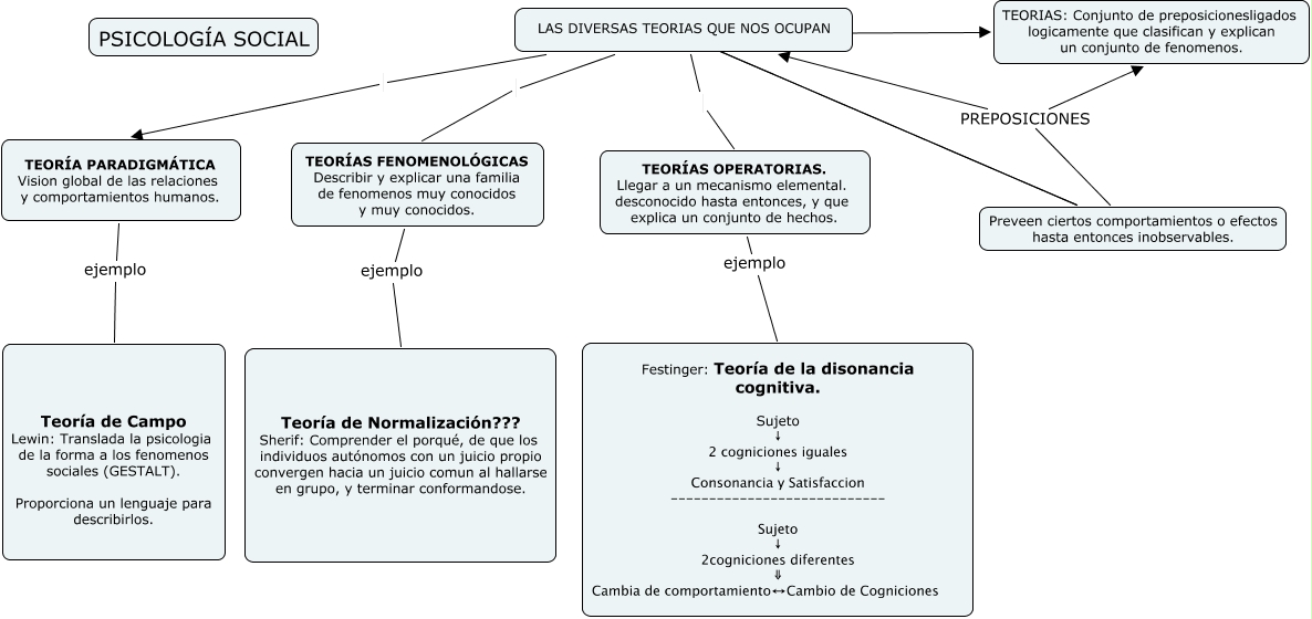Este Cmap, tiene información relacionada con: LAS DIVERSAS TEORIAS QUE NOS OCUPAN, Preveen ciertos comportamientos o efectos hasta entonces inobservables. ???? TEORIAS: Conjunto de preposicionesligados logicamente que clasifican y explican un conjunto de fenomenos., Preveen ciertos comportamientos o efectos hasta entonces inobservables. ???? TEORIAS: Conjunto de preposicionesligados logicamente que clasifican y explican un conjunto de fenomenos., TEORÍA PARADIGMÁTICA Vision global de las relaciones y comportamientos humanos. ejemplo Teoría de Campo Lewin: Translada la psicologia de la forma a los fenomenos sociales (GESTALT). Proporciona un lenguaje para describirlos., TEORÍAS FENOMENOLÓGICAS Describir y explicar una familia de fenomenos muy conocidos y muy conocidos. ejemplo Teoría de Normalización??? Sherif: Comprender el porqué, de que los individuos autónomos con un juicio propio convergen hacia un juicio comun al hallarse en grupo, y terminar conformandose., Preveen ciertos comportamientos o efectos hasta entonces inobservables. PREPOSICIONES LAS DIVERSAS TEORIAS QUE NOS OCUPAN, TEORÍAS OPERATORIAS. Llegar a un mecanismo elemental. desconocido hasta entonces, y que explica un conjunto de hechos. ejemplo Festinger: Teoría de la disonancia cognitiva. Sujeto ↓ 2 cogniciones iguales ↓ Consonancia y Satisfaccion ---------------------------- Sujeto ↓ 2cogniciones diferentes ⇓ Cambia de comportamiento↔Cambio de Cogniciones, LAS DIVERSAS TEORIAS QUE NOS OCUPAN TEORÍAS OPERATORIAS. Llegar a un mecanismo elemental. desconocido hasta entonces, y que explica un conjunto de hechos., LAS DIVERSAS TEORIAS QUE NOS OCUPAN TEORÍA PARADIGMÁTICA Vision global de las relaciones y comportamientos humanos., Preveen ciertos comportamientos o efectos hasta entonces inobservables. PREPOSICIONES TEORIAS: Conjunto de preposicionesligados logicamente que clasifican y explican un conjunto de fenomenos., LAS DIVERSAS TEORIAS QUE NOS OCUPAN TEORÍAS FENOMENOLÓGICAS Describir y explicar una familia de fenomenos muy conocidos y muy conocidos.