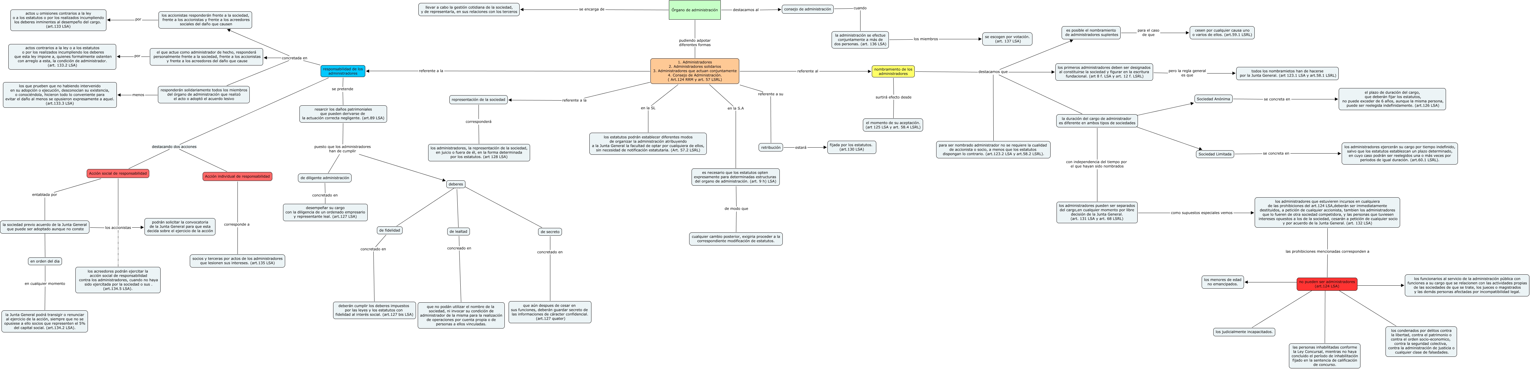 Este mapa conceptual tiene información relacionada a: caso6merca2, en orden del dia en cualquier momento la Junta General podrá transigir o renunciar al ejercicio de la acción, siempre que no se opusiese a ello socios que representen el 5% del capital social. (art.134.2 LSA)., deberes de fidelidad, responsabilidad de los administradores destacando dos acciones Acción individual de responsabilidad, consejo de administración cuando la administración se efectue conjuntamente a más de dos personas. (art. 136 LSA), la sociedad previo acuerdo de la Junta General que puede ser adoptado aunque no conste en orden del dia, nombramiento de los administradores destacamos que la duración del cargo de administrador es diferente en ambos tipos de sociedades, 1. Administradores 2. Administradores solidarios 3. Administradores que actuan conjuntamente 4. Consejo de Administración. ( Art.124 RRM y art. 57 LSRL) en la SL los estatutos podrán establecer diferentes modos de organizar la administración atribuyendo a la Junta General la facultad de optar por cualquiera de ellos, sin necesidad de notificación estatutaria. (Art. 57.2 LSRL), la sociedad previo acuerdo de la Junta General que puede ser adoptado aunque no conste los accionistas los acreedores podrán ejercitar la acción social de responsabilidad contra los administradores, cuando no haya sido ejercitada por la sociedad o sus . (art.134.5 LSA)., de diligente administración concretado en desempeñar su cargo con la diligencia de un ordenado empresario y representante leal. (art.127 LSA), 1. Administradores 2. Administradores solidarios 3. Administradores que actuan conjuntamente 4. Consejo de Administración. ( Art.124 RRM y art. 57 LSRL) en la S.A es necesario que los estatutos opten expresamente para determinadas estructuras del organo de administración. (art. 9 h) LSA)