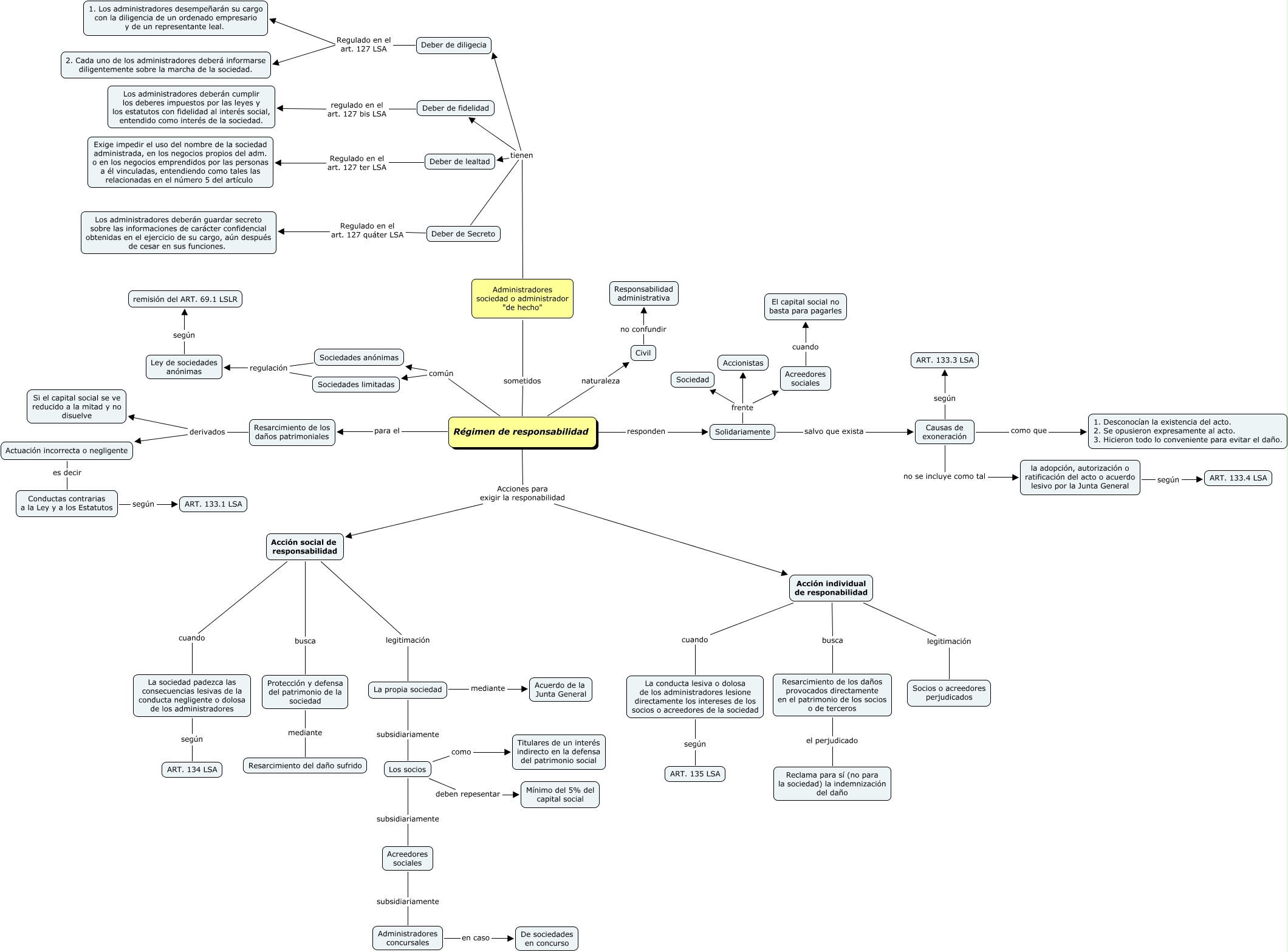 Este mapa conceptual tiene información relacionada a: RESPONSABILIDAD ADMINISTRADORES (CASO 6), Régimen de responsabilidad naturaleza Civil, Causas de exoneración según ART. 133.3 LSA, Sociedades limitadas regulación Ley de sociedades anónimas, Acción individual de responabilidad cuando La conducta lesiva o dolosa de los administradores lesione directamente los intereses de los socios o acreedores de la sociedad, Administradores sociedad o administrador "de hecho" sometidos Régimen de responsabilidad, Régimen de responsabilidad Acciones para exigir la responabilidad Acción social de responsabilidad, Deber de diligecia Regulado en el art. 127 LSA 2. Cada uno de los administradores deberá informarse diligentemente sobre la marcha de la sociedad., Los socios deben repesentar Mínimo del 5% del capital social, Actuación incorrecta o negligente es decir Conductas contrarias a la Ley y a los Estatutos, Administradores sociedad o administrador "de hecho" tienen Deber de lealtad, Régimen de responsabilidad Acciones para exigir la responabilidad Acción individual de responabilidad, Ley de sociedades anónimas según remisión del ART. 69.1 LSLR, Resarcimiento de los daños patrimoniales derivados Si el capital social se ve reducido a la mitad y no disuelve, Administradores concursales en caso De sociedades en concurso, Deber de diligecia Regulado en el art. 127 LSA 1. Los administradores desempeñarán su cargo con la diligencia de un ordenado empresario y de un representante leal., Solidariamente frente Acreedores sociales, Solidariamente frente Sociedad, Acción individual de responabilidad legitimación Socios o acreedores perjudicados, Resarcimiento de los daños provocados directamente en el patrimonio de los socios o de terceros el perjudicado Reclama para sí (no para la sociedad) la indemnización del daño, Causas de exoneración no se incluye como tal la adopción, autorización o ratificación del acto o acuerdo lesivo por la Junta General