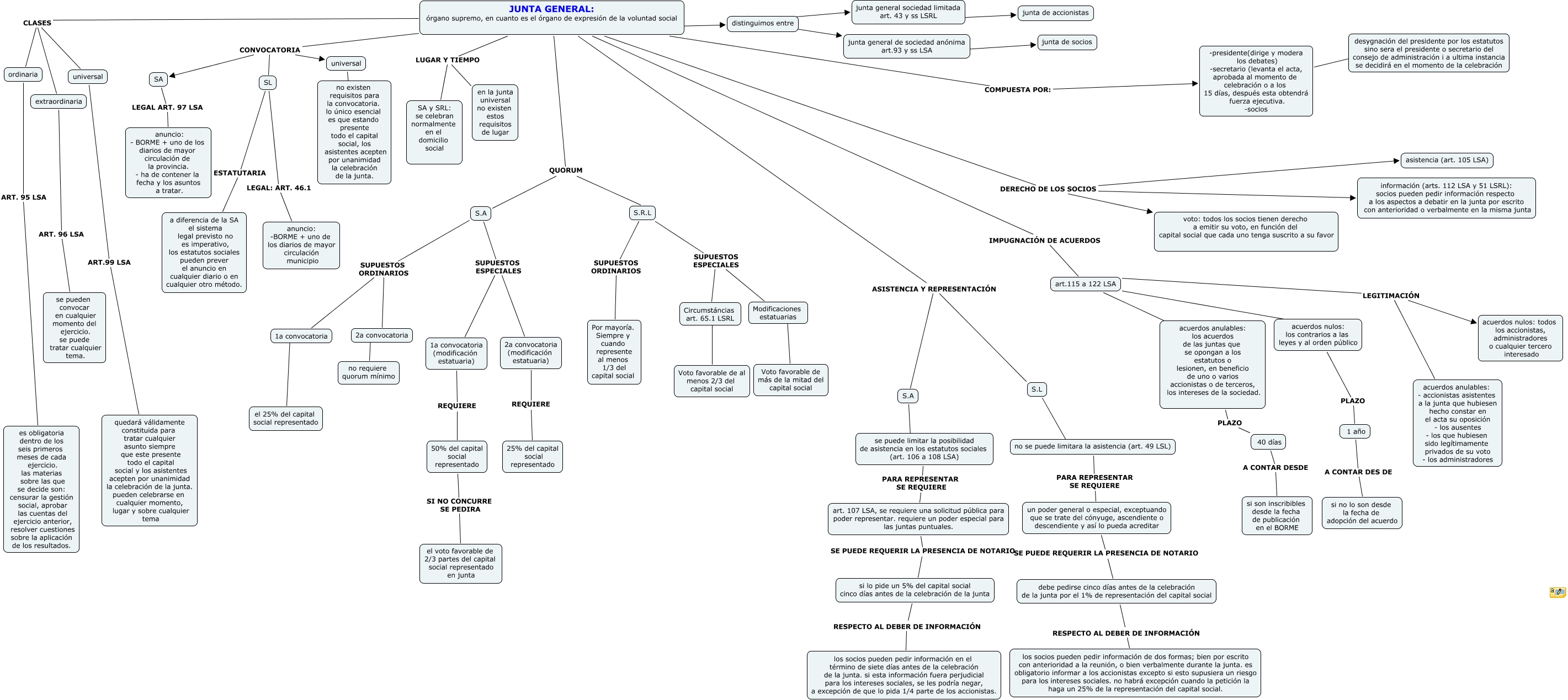 Este Cmap, tiene información relacionada con: CMap 5 modificat, JUNTA GENERAL: órgano supremo, en cuanto es el órgano de expresión de la voluntad social ASISTENCIA Y REPRESENTACIÓN S.L, universal ART.99 LSA quedará válidamente constituida para tratar cualquier asunto siempre que este presente todo el capital social y los asistentes acepten por unanimidad la celebración de la junta. pueden celebrarse en cualquier momento, lugar y sobre cualquier tema, JUNTA GENERAL: órgano supremo, en cuanto es el órgano de expresión de la voluntad social QUORUM S.A, debe pedirse cinco días antes de la celebración de la junta por el 1% de representación del capital social RESPECTO AL DEBER DE INFORMACIÓN los socios pueden pedir información de dos formas; bien por escrito con anterioridad a la reunión, o bien verbalmente durante la junta. es obligatorio informar a los accionistas excepto si esto supusiera un riesgo para los intereses sociales. no habrá excepción cuando la petición la haga un 25% de la representación del capital social., JUNTA GENERAL: órgano supremo, en cuanto es el órgano de expresión de la voluntad social ???? distinguimos entre, 50% del capital social representado SI NO CONCURRE SE PEDIRA el voto favorable de 2/3 partes del capital social representado en junta, distinguimos entre junta general de sociedad anónima art.93 y ss LSA, distinguimos entre junta general sociedad limitada art. 43 y ss LSRL, SL ESTATUTARIA a diferencia de la SA el sistema legal previsto no es imperativo, los estatutos sociales pueden prever el anuncio en cualquier diario o en cualquier otro método., JUNTA GENERAL: órgano supremo, en cuanto es el órgano de expresión de la voluntad social CONVOCATORIA SL, un poder general o especial, exceptuando que se trate del cónyuge, ascendiente o descendiente y así lo pueda acreditar SE PUEDE REQUERIR LA PRESENCIA DE NOTARIO debe pedirse cinco días antes de la celebración de la junta por el 1% de representación del capital social, 1a convocatoria (modificación estatuaria) REQUIERE 50% del capital social representado, 2a convocatoria ???? no requiere quorum mínimo, JUNTA GENERAL: órgano supremo, en cuanto es el órgano de expresión de la voluntad social CLASES universal, junta general sociedad limitada art. 43 y ss LSRL ???? junta de accionistas, universal ???? no existen requisitos para la convocatoria. lo único esencial es que estando presente todo el capital social, los asistentes acepten por unanimidad la celebración de la junta., 1 año A CONTAR DES DE si no lo son desde la fecha de adopción del acuerdo, JUNTA GENERAL: órgano supremo, en cuanto es el órgano de expresión de la voluntad social DERECHO DE LOS SOCIOS información (arts. 112 LSA y 51 LSRL): socios pueden pedir información respecto a los aspectos a debatir en la junta por escrito con anterioridad o verbalmente en la misma junta, Circumstáncias art. 65.1 LSRL ???? Voto favorable de al menos 2/3 del capital social, art.115 a 122 LSA LEGITIMACIÓN acuerdos anulables: - accionistas asistentes a la junta que hubiesen hecho constar en el acta su oposición - los ausentes - los que hubiesen sido legítimamente privados de su voto - los administradores