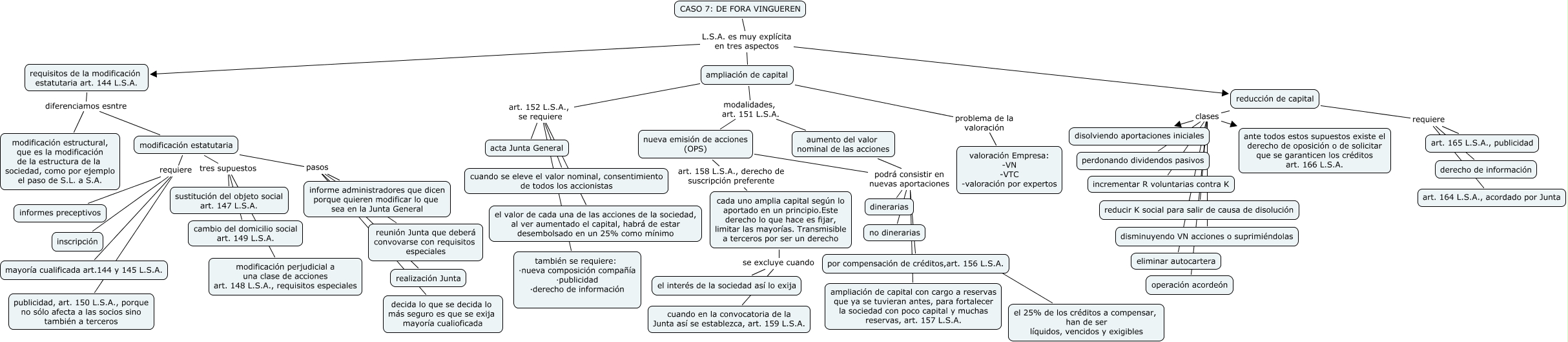 Este mapa conceptual tiene información relacionada a: caso 7, de fora vingueren, modificación estatutaria pasos reunión Junta que deberá convovarse con requisitos especiales, reducción de capital clases ante todos estos supuestos existe el derecho de oposición o de solicitar que se garanticen los créditos art. 166 L.S.A., reducción de capital clases eliminar autocartera, aumento del valor nominal de las acciones podrá consistir en nuevas aportaciones no dinerarias, nueva emisión de acciones (OPS) art. 158 L.S.A., derecho de suscripción preferente cada uno amplia capital según lo aportado en un principio.Este derecho lo que hace es fijar, limitar las mayorías. Transmisible a terceros por ser un derecho, CASO 7: DE FORA VINGUEREN L.S.A. es muy explícita en tres aspectos requisitos de la modificación estatutaria art. 144 L.S.A., reducción de capital clases perdonando dividendos pasivos, reducción de capital clases disolviendo aportaciones iniciales, aumento del valor nominal de las acciones podrá consistir en nuevas aportaciones por compensación de créditos,art. 156 L.S.A., por compensación de créditos,art. 156 L.S.A. ???? el 25% de los créditos a compensar, han de ser líquidos, vencidos y exigibles