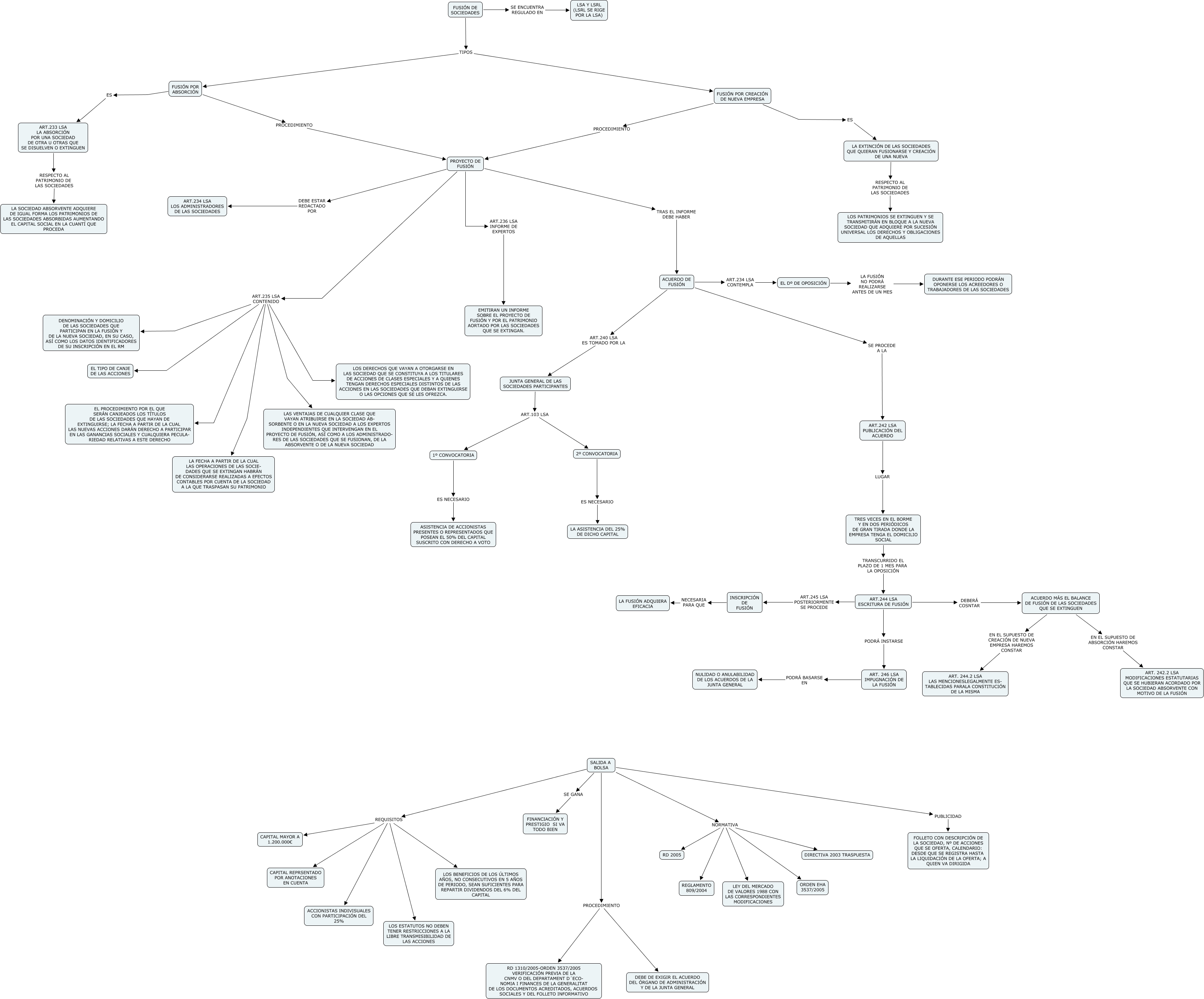 Este mapa conceptual tiene información relacionada a: PR9, SALIDA A BOLSA REQUISITOS CAPITAL REPRSENTADO POR ANOTACIONES EN CUENTA, PROYECTO DE FUSIÓN ART.235 LSA CONTENIDO EL PROCEDIMIENTO POR EL QUE SERÁN CANJEADOS LOS TÍTULOS DE LAS SOCIEDADES QUE HAYAN DE EXTINGUIRSE; LA FECHA A PARTIR DE LA CUAL LAS NUEVAS ACCIONES DARÁN DERECHO A PARTICIPAR EN LAS GANANCIAS SOCIALES Y CUALQUIERA PECULA- RIEDAD RELATIVAS A ESTE DERECHO, ART.242 LSA PUBLICACIÓN DEL ACUERDO LUGAR TRES VECES EN EL BORME Y EN DOS PERIÓDICOS DE GRAN TIRADA DONDE LA EMPRESA TENGA EL DOMICILIO SOCIAL, ART.244 LSA ESCRITURA DE FUSIÓN PODRÁ INSTARSE ART. 246 LSA IMPUGNACIÓN DE LA FUSIÓN, SALIDA A BOLSA NORMATIVA LEY DEL MERCADO DE VALORES 1988 CON LAS CORRESPONDIENTES MODIFICACIONES, PROYECTO DE FUSIÓN ART.236 LSA INFORME DE EXPERTOS EMITIRAN UN INFORME SOBRE EL PROYECTO DE FUSIÓN Y POR EL PATRIMONIO AORTADO POR LAS SOCIEDADES QUE SE EXTINGAN., SALIDA A BOLSA SE GANA FINANCIACIÓN Y PRESTIGIO SI VA TODO BIEN, PROYECTO DE FUSIÓN ART.235 LSA CONTENIDO DENOMINACIÓN Y DOMICILIO DE LAS SOCIEDADES QUE PARTICIPAN EN LA FUSIÓN Y DE LA NUEVA SOCIEDAD, EN SU CASO, ASÍ COMO LOS DATOS IDENTIFICADORES DE SU INSCRIPCIÓN EN EL RM, SALIDA A BOLSA REQUISITOS LOS BENEFICIOS DE LOS ÚLTIMOS AÑOS, NO CONSECUTIVOS EN 5 AÑOS DE PERIODO, SEAN SUFICIENTES PARA REPARTIR DIVIDENDOS DEL 6% DEL CAPITAL, FUSIÓN POR CREACIÓN DE NUEVA EMPRESA ES LA EXTINCIÓN DE LAS SOCIEDADES QUE QUIERAN FUSIONARSE Y CREACIÓN DE UNA NUEVA