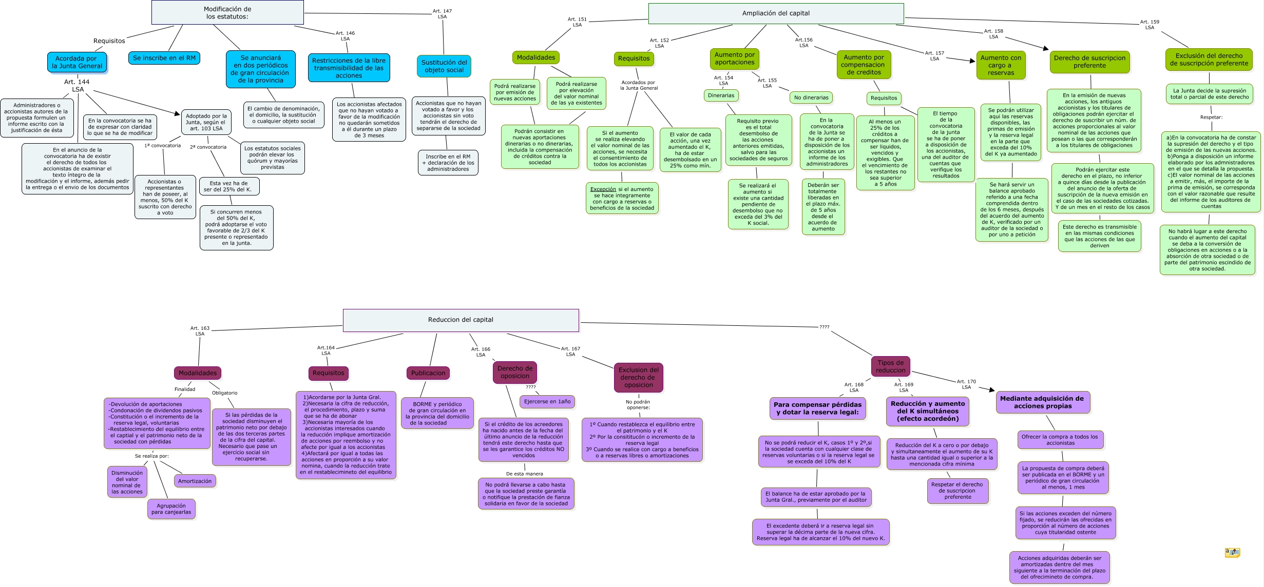 Practica 7, Acordada por la Junta General Art. 144 LSA En el anuncio de la convocatoria ha de existir el derecho de todos los accionistas de examinar el texto íntegro de la modificación y el informe, además pedir la entrega o el envio de los documentos, Accionistas que no hayan votado a favor y los accionistas sin voto tendrán el derecho de separarse de la sociedad ???? Inscribe en el RM + declaración de los administradores, Ampliación del capital Art. 158 LSA Derecho de suscripcion preferente, Reducción y aumento del K simultáneos (efecto acordeón) ???? Reducción del K a cero o por debajo y simultaneamente el aumento de su K hasta una cantidad igual o superior a la mencionada cifra mínima, En la convocatoria de la Junta se ha de poner a disposición de los accionistas un informe de los administradores ???? Deberán ser totalmente liberadas en el plazo máx. de 5 años desde el acuerdo de aumento, Acordada por la Junta General Art. 144 LSA Administradores o accionistas autores de la propuesta formulen un informe escrito con la justificación de ésta, Reduccion del capital ???? Publicacion, Ampliación del capital Art. 159 LSA Exclusión del derecho de suscripción preferente, Requisitos Acordados por la Junta General El valor de cada acción, una vez aumentado el K, ha de estar desembolsado en un 25% como mín., Modalidades Finalidad -Devolución de aportaciones -Condonación de dividendos pasivos -Constitución o el incremento de la reserva legal, voluntarias -Restablecimiento del equilibrio entre el captial y el patrimonio neto de la sociedad con pérdidas