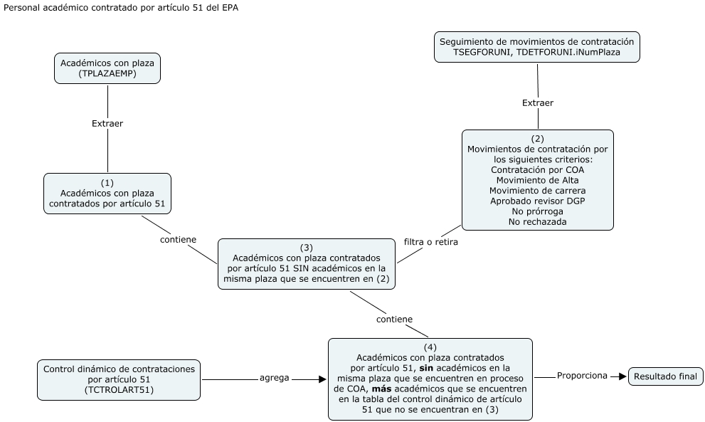 Este Cmap, tiene información relacionada con: 20080424ProcesoExtracciónArt51, (3) Académicos con plaza contratados por artículo 51 SIN académicos en la misma plaza que se encuentren en (2) contiene (4) Académicos con plaza contratados por artículo 51, sin académicos en la misma plaza que se encuentren en proceso de COA, más académicos que se encuentren en la tabla del control dinámico de artículo 51 que no se encuentran en (3), Académicos con plaza (TPLAZAEMP) Extraer (1) Académicos con plaza contratados por artículo 51, (2) Movimientos de contratación por los siguientes criterios: Contratación por COA Movimiento de Alta Movimiento de carrera Aprobado revisor DGP No prórroga No rechazada filtra o retira (3) Académicos con plaza contratados por artículo 51 SIN académicos en la misma plaza que se encuentren en (2), (4) Académicos con plaza contratados por artículo 51, sin académicos en la misma plaza que se encuentren en proceso de COA, más académicos que se encuentren en la tabla del control dinámico de artículo 51 que no se encuentran en (3) Proporciona Resultado final, (1) Académicos con plaza contratados por artículo 51 contiene (3) Académicos con plaza contratados por artículo 51 SIN académicos en la misma plaza que se encuentren en (2), Seguimiento de movimientos de contratación TSEGFORUNI, TDETFORUNI.iNumPlaza Extraer (2) Movimientos de contratación por los siguientes criterios: Contratación por COA Movimiento de Alta Movimiento de carrera Aprobado revisor DGP No prórroga No rechazada, Control dinámico de contrataciones por artículo 51 (TCTROLART51) agrega (4) Académicos con plaza contratados por artículo 51, sin académicos en la misma plaza que se encuentren en proceso de COA, más académicos que se encuentren en la tabla del control dinámico de artículo 51 que no se encuentran en (3)