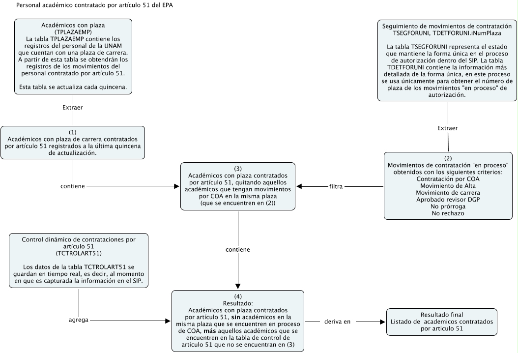 Este Cmap, tiene información relacionada con: 20080424ProcesoExtracciónArt51_v1_02, (4) Resultado: Académicos con plaza contratados por artículo 51, sin académicos en la misma plaza que se encuentren en proceso de COA, más aquellos académicos que se encuentren en la tabla de control de artículo 51 que no se encuentran en (3) deriva en Resultado final Listado de academicos contratados por articulo 51, (2) Movimientos de contratación "en proceso" obtenidos con los siguientes criterios: Contratación por COA Movimiento de Alta Movimiento de carrera Aprobado revisor DGP No prórroga No rechazo filtra (3) Académicos con plaza contratados por artículo 51, quitando aquellos académicos que tengan movimientos por COA en la misma plaza (que se encuentren en (2)), (3) Académicos con plaza contratados por artículo 51, quitando aquellos académicos que tengan movimientos por COA en la misma plaza (que se encuentren en (2)) contiene (4) Resultado: Académicos con plaza contratados por artículo 51, sin académicos en la misma plaza que se encuentren en proceso de COA, más aquellos académicos que se encuentren en la tabla de control de artículo 51 que no se encuentran en (3), Seguimiento de movimientos de contratación TSEGFORUNI, TDETFORUNI.iNumPlaza La tabla TSEGFORUNI representa el estado que mantiene la forma única en el proceso de autorización dentro del SIP. La tabla TDETFORUNI contiene la información más detallada de la forma única, en este proceso se usa únicamente para obtener el número de plaza de los movimientos "en proceso" de autorización. Extraer (2) Movimientos de contratación "en proceso" obtenidos con los siguientes criterios: Contratación por COA Movimiento de Alta Movimiento de carrera Aprobado revisor DGP No prórroga No rechazo, (1) Académicos con plaza de carrera contratados por artículo 51 registrados a la última quincena de actualización. contiene (3) Académicos con plaza contratados por artículo 51, quitando aquellos académicos que tengan movimientos por COA en la misma plaza (que se encuentren en (2)), Control dinámico de contrataciones por artículo 51 (TCTROLART51) Los datos de la tabla TCTROLART51 se guardan en tiempo real, es decir, al momento en que es capturada la información en el SIP. agrega (4) Resultado: Académicos con plaza contratados por artículo 51, sin académicos en la misma plaza que se encuentren en proceso de COA, más aquellos académicos que se encuentren en la tabla de control de artículo 51 que no se encuentran en (3), Académicos con plaza (TPLAZAEMP) La tabla TPLAZAEMP contiene los registros del personal de la UNAM que cuentan con una plaza de carrera. A partir de esta tabla se obtendrán los registros de los movimientos del personal contratado por artículo 51. Esta tabla se actualiza cada quincena. Extraer (1) Académicos con plaza de carrera contratados por artículo 51 registrados a la última quincena de actualización.