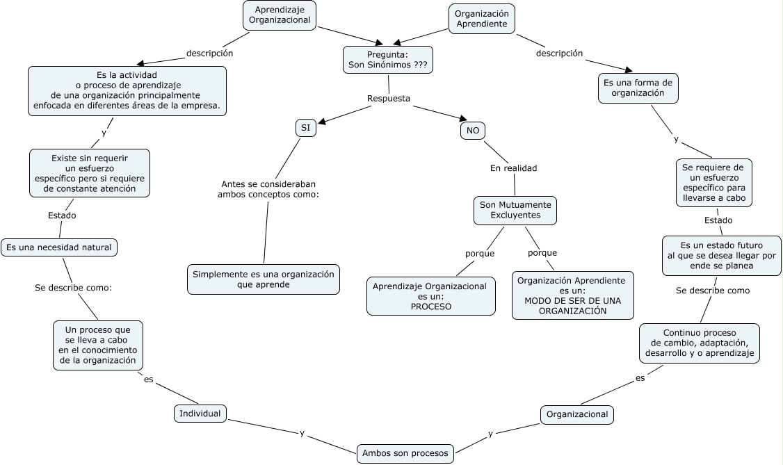 Este Cmap, tiene información relacionada con: Mapa Conceptual 1, Es la actividad o proceso de aprendizaje de una organización principalmente enfocada en diferentes áreas de la empresa. y Existe sin requerir un esfuerzo específico pero si requiere de constante atención, Pregunta: Son Sinónimos ??? Respuesta NO, Continuo proceso de cambio, adaptación, desarrollo y o aprendizaje es Organizacional, SI Antes se consideraban ambos conceptos como: Simplemente es una organización que aprende, Aprendizaje Organizacional Pregunta: Son Sinónimos ???, Organización Aprendiente descripción Es una forma de organización, Es una necesidad natural Se describe como: Un proceso que se lleva a cabo en el conocimiento de la organización, Pregunta: Son Sinónimos ??? Respuesta SI, NO En realidad Son Mutuamente Excluyentes, Son Mutuamente Excluyentes porque Organización Aprendiente es un: MODO DE SER DE UNA ORGANIZACIÓN, Existe sin requerir un esfuerzo específico pero si requiere de constante atención Estado Es una necesidad natural, Es un estado futuro al que se desea llegar por ende se planea Se describe como Continuo proceso de cambio, adaptación, desarrollo y o aprendizaje, Aprendizaje Organizacional descripción Es la actividad o proceso de aprendizaje de una organización principalmente enfocada en diferentes áreas de la empresa., Organización Aprendiente Pregunta: Son Sinónimos ???, Organizacional y Ambos son procesos, Individual y Ambos son procesos, Son Mutuamente Excluyentes porque Aprendizaje Organizacional es un: PROCESO, Se requiere de un esfuerzo específico para llevarse a cabo Estado Es un estado futuro al que se desea llegar por ende se planea, Es una forma de organización y Se requiere de un esfuerzo específico para llevarse a cabo, Un proceso que se lleva a cabo en el conocimiento de la organización es Individual