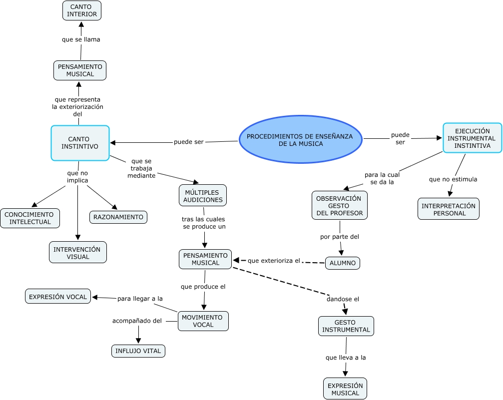 Este mapa conceptual tiene información relacionada a: PROCEDIMIENTOS NO TERMINADO, GESTO INSTRUMENTAL que lleva a la EXPRESIÓN MUSICAL, CANTO INSTINTIVO que no implica INTERVENCIÓN VISUAL, EJECUCIÓN INSTRUMENTAL INSTINTIVA que no estimula INTERPRETACIÓN PERSONAL, CANTO INSTINTIVO que no implica RAZONAMIENTO, MÚLTIPLES AUDICIONES tras las cuales se produce un PENSAMIENTO MUSICAL, EJECUCIÓN INSTRUMENTAL INSTINTIVA para la cual se da la OBSERVACIÓN GESTO DEL PROFESOR, OBSERVACIÓN GESTO DEL PROFESOR por parte del ALUMNO, MOVIMIENTO VOCAL acompañado del INFLUJO VITAL, PENSAMIENTO MUSICAL que produce el MOVIMIENTO VOCAL, PENSAMIENTO MUSICAL que se llama CANTO INTERIOR, PROCEDIMIENTOS DE ENSEÑANZA DE LA MUSICA puede ser EJECUCIÓN INSTRUMENTAL INSTINTIVA, CANTO INSTINTIVO que se trabaja mediante MÚLTIPLES AUDICIONES, CANTO INSTINTIVO que representa la exteriorización del PENSAMIENTO MUSICAL, CANTO INSTINTIVO que no implica CONOCIMIENTO INTELECTUAL, PENSAMIENTO MUSICAL dandose el GESTO INSTRUMENTAL, ALUMNO que exterioriza el PENSAMIENTO MUSICAL, MOVIMIENTO VOCAL para llegar a la EXPRESIÓN VOCAL, PROCEDIMIENTOS DE ENSEÑANZA DE LA MUSICA puede ser CANTO INSTINTIVO