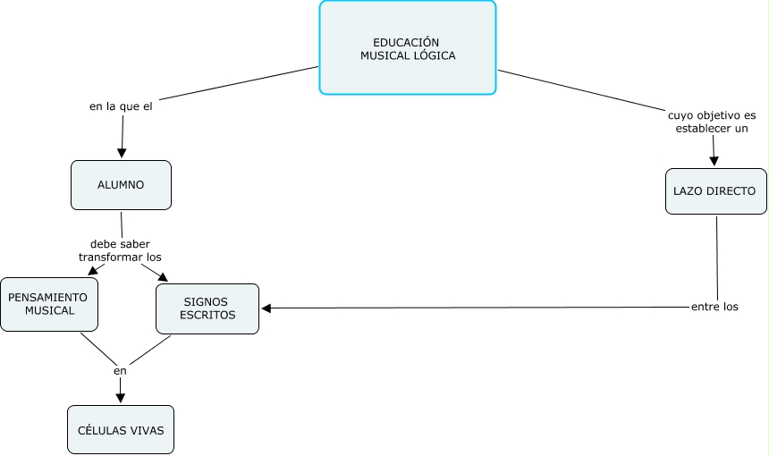 Este mapa conceptual tiene información relacionada a: PROCEDIMIENTOS 4, ALUMNO debe saber transformar los PENSAMIENTO MUSICAL, PENSAMIENTO MUSICAL en CÉLULAS VIVAS, EDUCACIÓN MUSICAL LÓGICA cuyo objetivo es establecer un LAZO DIRECTO, LAZO DIRECTO entre los SIGNOS ESCRITOS, ALUMNO debe saber transformar los SIGNOS ESCRITOS, EDUCACIÓN MUSICAL LÓGICA en la que el ALUMNO, SIGNOS ESCRITOS en CÉLULAS VIVAS