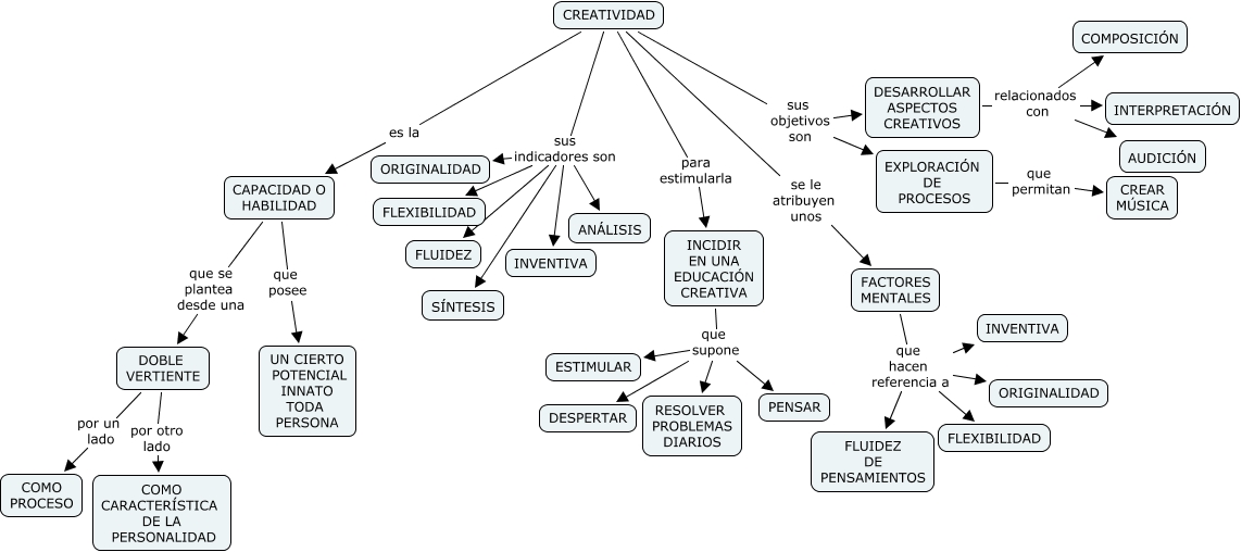 Este Cmap, tiene información relacionada con: CREATIVIDAD, CREATIVIDAD sus objetivos son DESARROLLAR ASPECTOS CREATIVOS, INCIDIR EN UNA EDUCACIÓN CREATIVA que supone RESOLVER PROBLEMAS DIARIOS, FACTORES MENTALES que hacen referencia a FLEXIBILIDAD, CREATIVIDAD sus indicadores son FLEXIBILIDAD, INCIDIR EN UNA EDUCACIÓN CREATIVA que supone PENSAR, CREATIVIDAD para estimularla INCIDIR EN UNA EDUCACIÓN CREATIVA, CREATIVIDAD sus indicadores son S�?NTESIS, CAPACIDAD O HABILIDAD que posee UN CIERTO POTENCIAL INNATO TODA PERSONA, INCIDIR EN UNA EDUCACIÓN CREATIVA que supone DESPERTAR, CAPACIDAD O HABILIDAD que se plantea desde una DOBLE VERTIENTE, DESARROLLAR ASPECTOS CREATIVOS relacionados con AUDICIÓN, CREATIVIDAD se le atribuyen unos FACTORES MENTALES, CREATIVIDAD es la CAPACIDAD O HABILIDAD, CREATIVIDAD sus indicadores son FLUIDEZ, DESARROLLAR ASPECTOS CREATIVOS relacionados con COMPOSICIÓN, CREATIVIDAD sus indicadores son ORIGINALIDAD, CREATIVIDAD sus indicadores son INVENTIVA, FACTORES MENTALES que hacen referencia a FLUIDEZ DE PENSAMIENTOS, CREATIVIDAD sus indicadores son AN�?LISIS, INCIDIR EN UNA EDUCACIÓN CREATIVA que supone ESTIMULAR