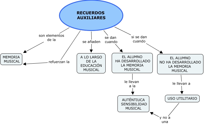 Este Cmap, tiene información relacionada con: recuerdos auxiliares, EL ALUMNO HA DESARROLLADO LA MEMORIA MUSICAL le llevan a la AUTÉNTIUCA SENSIBILIDAD MUSICAL, RECUERDOS AUXILIARES si se dan cuando EL ALUMNO NO HA DESARROLLADO LA MEMORIA MUSICAL, EL ALUMNO NO HA DESARROLLADO LA MEMORIA MUSICAL le llevan a USO UTILITARIO, RECUERDOS AUXILIARES son elementos de la MEMORIA MUSICAL, USO UTILITARIO y no a una AUTÉNTIUCA SENSIBILIDAD MUSICAL, RECUERDOS AUXILIARES se dan cuando EL ALUMNO HA DESARROLLADO LA MEMORIA MUSICAL, RECUERDOS AUXILIARES se añaden A LO LARGO DE LA EDUCACIÓN MUSICAL, RECUERDOS AUXILIARES refuerzan la MEMORIA MUSICAL