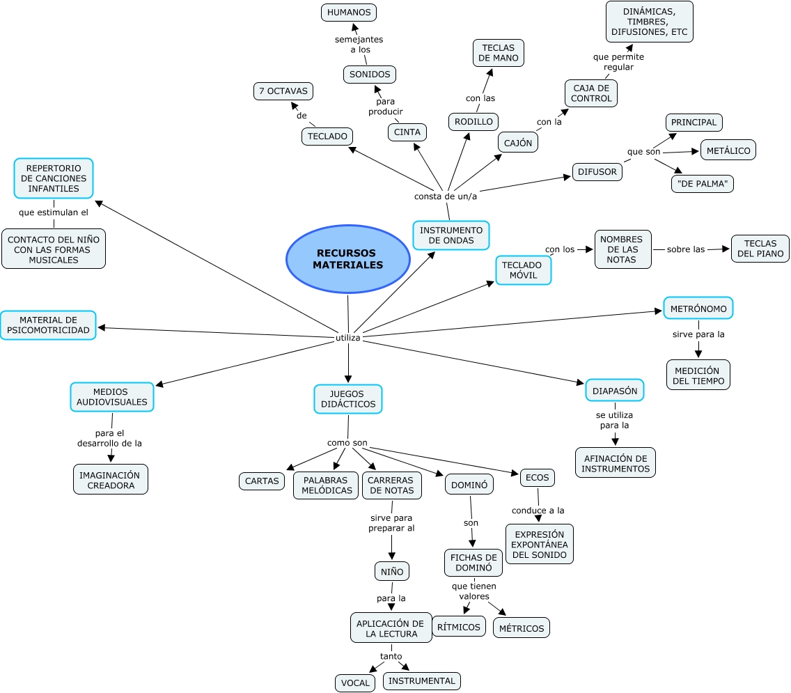 RECURSOS MATERIALES, DOMINÓ son FICHAS DE DOMINÓ, JUEGOS DID�?CTICOS como son ECOS, JUEGOS DID�?CTICOS como son CARTAS, INSTRUMENTO DE ONDAS consta de un/a TECLADO, RECURSOS MATERIALES utiliza MATERIAL DE PSICOMOTRICIDAD, DIFUSOR que son MET�?LICO, TECLADO MÓVIL con los NOMBRES DE LAS NOTAS, RECURSOS MATERIALES utiliza DIAPASÓN, INSTRUMENTO DE ONDAS consta de un/a RODILLO, TECLADO de 7 OCTAVAS