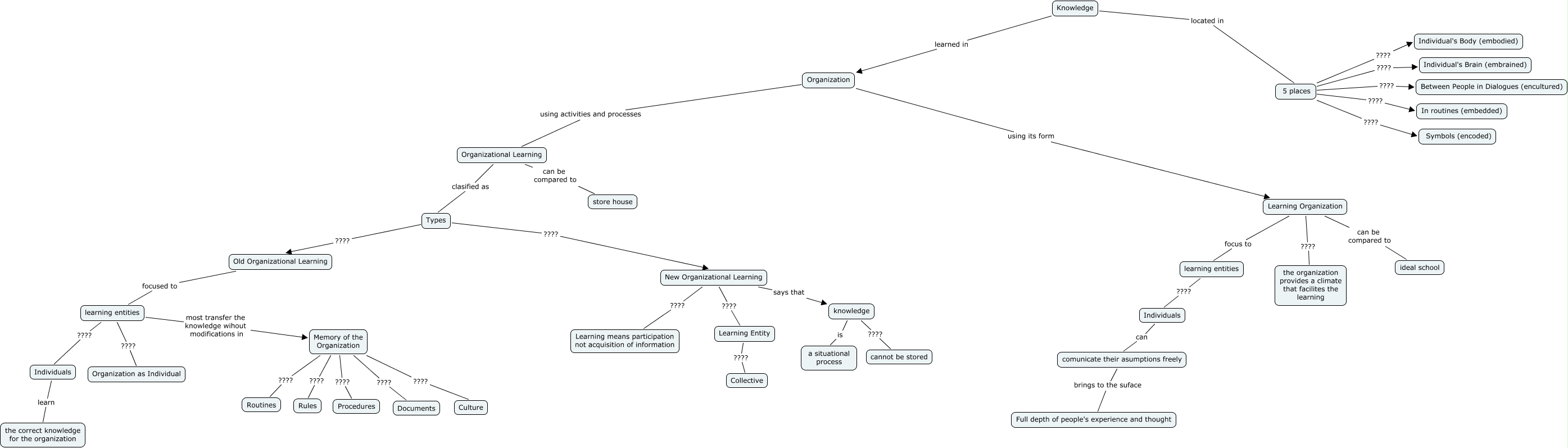 Este Cmap, tiene información relacionada con: Learning Organization VS Organizational Learning, Memory of the Organization ???? Routines, New Organizational Learning ???? Learning Entity, Individuals can comunicate their asumptions freely, Memory of the Organization ???? Documents, Knowledge learned in Organization, learning entities most transfer the knowledge wihout modifications in Memory of the Organization, Memory of the Organization ???? Procedures, Knowledge located in 5 places, Organizational Learning can be compared to store house, learning entities ???? Organization as Individual, Organization using activities and processes Organizational Learning, Old Organizational Learning focused to learning entities, Memory of the Organization ???? Rules, Types ???? Old Organizational Learning, Learning Entity ???? Collective, Learning Organization ???? the organization provides a climate that facilites the learning, 5 places ???? Individual's Brain (embrained), comunicate their asumptions freely brings to the suface Full depth of people's experience and thought, knowledge is a situational process, 5 places ???? Individual's Body (embodied)
