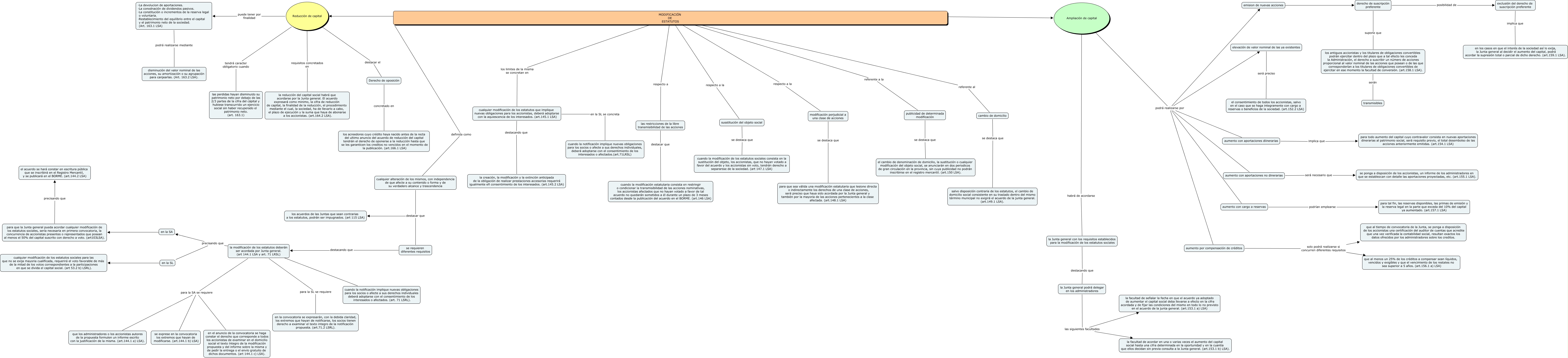 Este mapa conceptual tiene información relacionada a: caso7merca2, los antiguos accionistas y los titulares de obligaciones convertibles podrán ejercitar dentro del plazo que a tal efecto les conceda la Administración, el derecho a suscribir un número de acciones proporcional al valor nominal de las acciones que posean o de las que corresponderían a los titulares de obligaciones convertibles de ejercitar en ese momento la facultad de conversión. (art.158.1 LSA). serán transmisibles, susstitución del objeto social se destaca que cuando la modificación de los estatutos sociales consista en la sustitución del objeto, los accionistas, que no hayan votado a favor del acuerdo y los accionistas sin voto, tendrán derecho a separarsse de la sociedad. (art 147.1 LSA), cualquier modificación de los estatutos que implique nuevas obligaciones para los accionistas, deberá adoptarse con la aquiescencia de los interesados. (art.145.1 LSA) destacando que la creación, la modificación y la extinción anticipada de la obligación de realizar prestaciones accesorias requerirá igualmente eñ consentimiento de los interesados. (art.145.2 LSA), MODIFICACIÓN DE ESTATUTOS respecto a las restricciones de la libre transmisibilidad de las acciones, Derecho de oposición concretado en los acreedores cuyo crédito haya nacido antes de la recta del ultimo anuncio del acuerdo de reducción del capital tendrán el derecho de oponerse a la reducción hasta que se les garanticen los creditos no vencidos en el momento de la publicación. (art.166.1 LSA), aumento por compensación de créditos solo podrá realizarse si concurren diferentes requisitos que al menos un 25% de los créditos a compensar sean líquidos, vencidos y exigibles y que el vencimiento de los restates no sea superior a 5 años. (art.156.1 a) LSA), Ampliación de capital podrá realizarse por aumento con aportaciones no dinerarias, MODIFICACIÓN DE ESTATUTOS referente al cambio de domicilio, Reducción de capital destacar el Derecho de oposición, Reducción de capital requisitos concretados en la reducción del capital social habrá que acordarse por la Junta general. El acuerdo expresará como minimo, la cifra de reducción de capital, la finalidad de la reducción, el procedimiento mediante el cual, la sociedad, ha de llevarlo a cabo, el plazo de ejecución y la suma que haya de abonarse a los accionistas. (art.164.2 LSA).