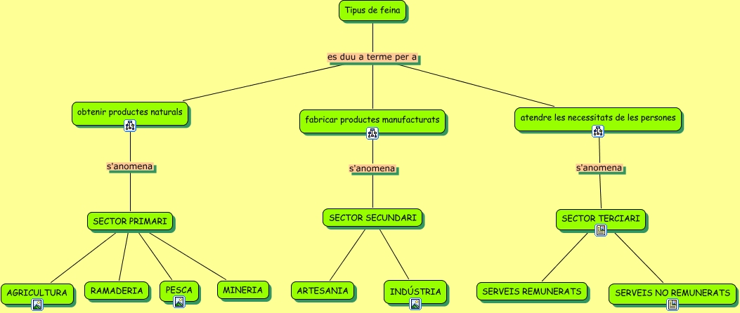 Este Cmap, tiene información relacionada con: CMAP PRINCIPAL, Tipus de feina es duu a terme per a obtenir productes naturals, SECTOR TERCIARI SERVEIS NO REMUNERATS, Tipus de feina es duu a terme per a fabricar productes manufacturats, SECTOR PRIMARI AGRICULTURA, SECTOR PRIMARI PESCA, SECTOR SECUNDARI ARTESANIA, SECTOR PRIMARI MINERIA, SECTOR TERCIARI SERVEIS REMUNERATS, Tipus de feina es duu a terme per a atendre les necessitats de les persones, SECTOR PRIMARI RAMADERIA, fabricar productes manufacturats s'anomena SECTOR SECUNDARI, atendre les necessitats de les persones s'anomena SECTOR TERCIARI, obtenir productes naturals s'anomena SECTOR PRIMARI, SECTOR SECUNDARI INDÚSTRIA