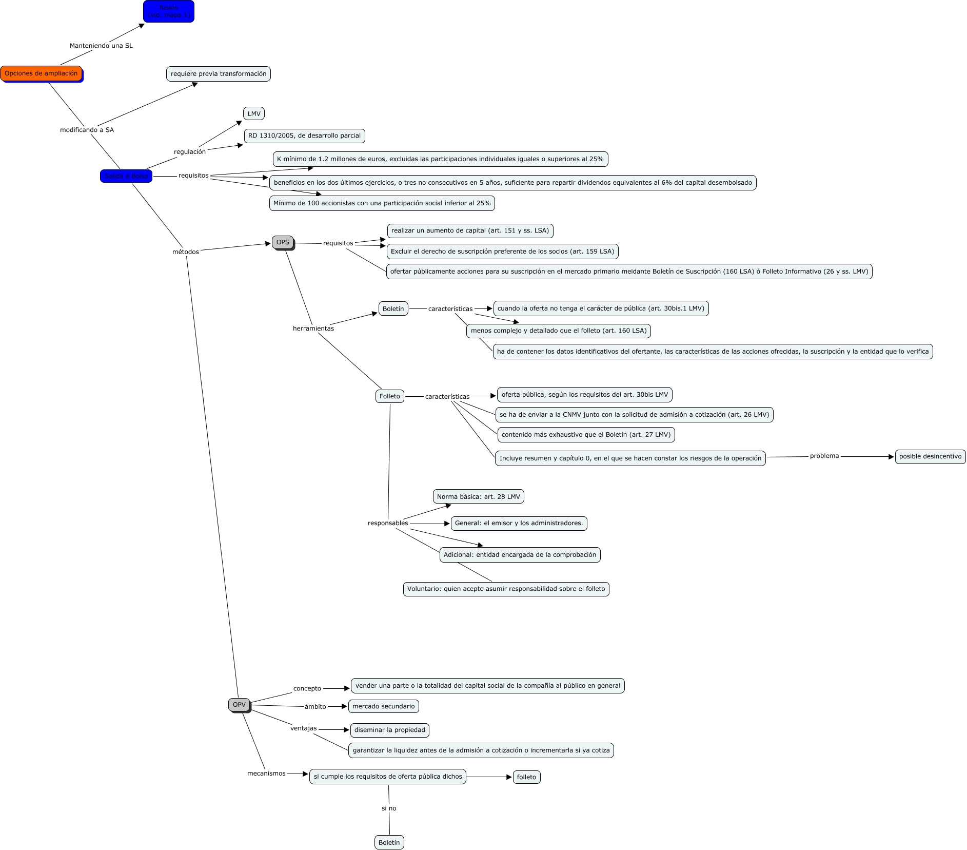 Este Cmap, tiene información relacionada con: caso9, mapa Bolsa, OPV concepto vender una parte o la totalidad del capital social de la compañía al público en general, Salida a Bolsa requisitos beneficios en los dos últimos ejercicios, o tres no consecutivos en 5 años, suficiente para repartir dividendos equivalentes al 6% del capital desembolsado, OPS requisitos realizar un aumento de capital (art. 151 y ss. LSA), Folleto responsables General: el emisor y los administradores., Salida a Bolsa requisitos K mínimo de 1.2 millones de euros, excluidas las participaciones individuales iguales o superiores al 25%, OPS requisitos ofertar públicamente acciones para su suscripción en el mercado primario meidante Boletín de Suscripción (160 LSA) ó Folleto Informativo (26 y ss. LMV), Folleto responsables Adicional: entidad encargada de la comprobación, Salida a Bolsa regulación LMV, Folleto características contenido más exhaustivo que el Boletín (art. 27 LMV), Folleto características se ha de enviar a la CNMV junto con la solicitud de admisión a cotización (art. 26 LMV), Opciones de ampliación Manteniendo una SL fusión (vid. mapa 1), OPV mecanismos si cumple los requisitos de oferta pública dichos, OPS herramientas Boletín, Salida a Bolsa métodos OPV, OPS herramientas Folleto, si cumple los requisitos de oferta pública dichos si no Boletín, Folleto responsables Norma básica: art. 28 LMV, OPV ámbito mercado secundario, Folleto características Incluye resumen y capítulo 0, en el que se hacen constar los riesgos de la operación, Salida a Bolsa métodos OPS