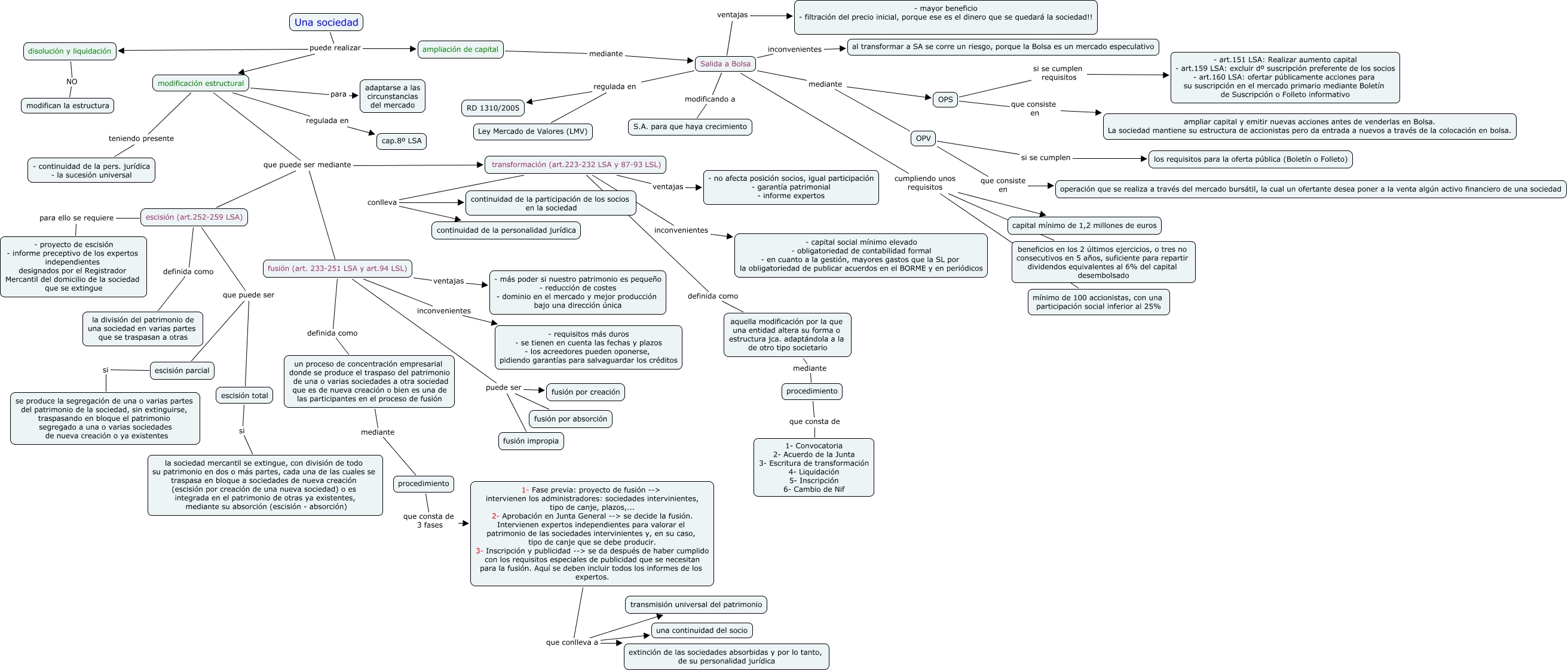 Este mapa conceptual tiene información relacionada a: Caso9, packman, ampliación de capital mediante Salida a Bolsa, transformación (art.223-232 LSA y 87-93 LSL) conlleva continuidad de la participación de los socios en la sociedad, disolución y liquidación NO modifican la estructura, fusión (art. 233-251 LSA y art.94 LSL) definida como un proceso de concentración empresarial donde se produce el traspaso del patrimonio de una o varias sociedades a otra sociedad que es de nueva creación o bien es una de las participantes en el proceso de fusión, Una sociedad puede realizar disolución y liquidación, un proceso de concentración empresarial donde se produce el traspaso del patrimonio de una o varias sociedades a otra sociedad que es de nueva creación o bien es una de las participantes en el proceso de fusión mediante procedimiento, transformación (art.223-232 LSA y 87-93 LSL) definida como aquella modificación por la que una entidad altera su forma o estructura jca. adaptándola a la de otro tipo societario, Salida a Bolsa inconvenientes al transformar a SA se corre un riesgo, porque la Bolsa es un mercado especulativo, Salida a Bolsa mediante OPS, procedimiento que consta de 1- Convocatoria 2- Acuerdo de la Junta 3- Escritura de transformación 4- Liquidación 5- Inscripción 6- Cambio de Nif, fusión (art. 233-251 LSA y art.94 LSL) puede ser fusión impropia, modificación estructural que puede ser mediante fusión (art. 233-251 LSA y art.94 LSL), OPV que consiste en operación que se realiza a través del mercado bursátil, la cual un ofertante desea poner a la venta algún activo financiero de una sociedad, procedimiento que consta de 3 fases 1- Fase previa: proyecto de fusión --> intervienen los administradores: sociedades intervinientes, tipo de canje, plazos,... 2- Aprobación en Junta General --> se decide la fusión. Intervienen expertos independientes para valorar el patrimonio de las sociedades intervinientes y, en su caso, tipo de canje que se debe producir. 3- Inscripción y publicidad --> se da después de haber cumplido con los requisitos especiales de publicidad que se necesitan para la fusión. Aquí se deben incluir todos los informes de los expertos., escisión (art.252-259 LSA) que puede ser escisión total, modificación estructural para adaptarse a las circunstancias del mercado, Una sociedad puede realizar ampliación de capital, modificación estructural que puede ser mediante escisión (art.252-259 LSA), fusión (art. 233-251 LSA y art.94 LSL) puede ser fusión por absorción, escisión (art.252-259 LSA) para ello se requiere - proyecto de escisión - informe preceptivo de los expertos independientes designados por el Registrador Mercantil del domicilio de la sociedad que se extingue