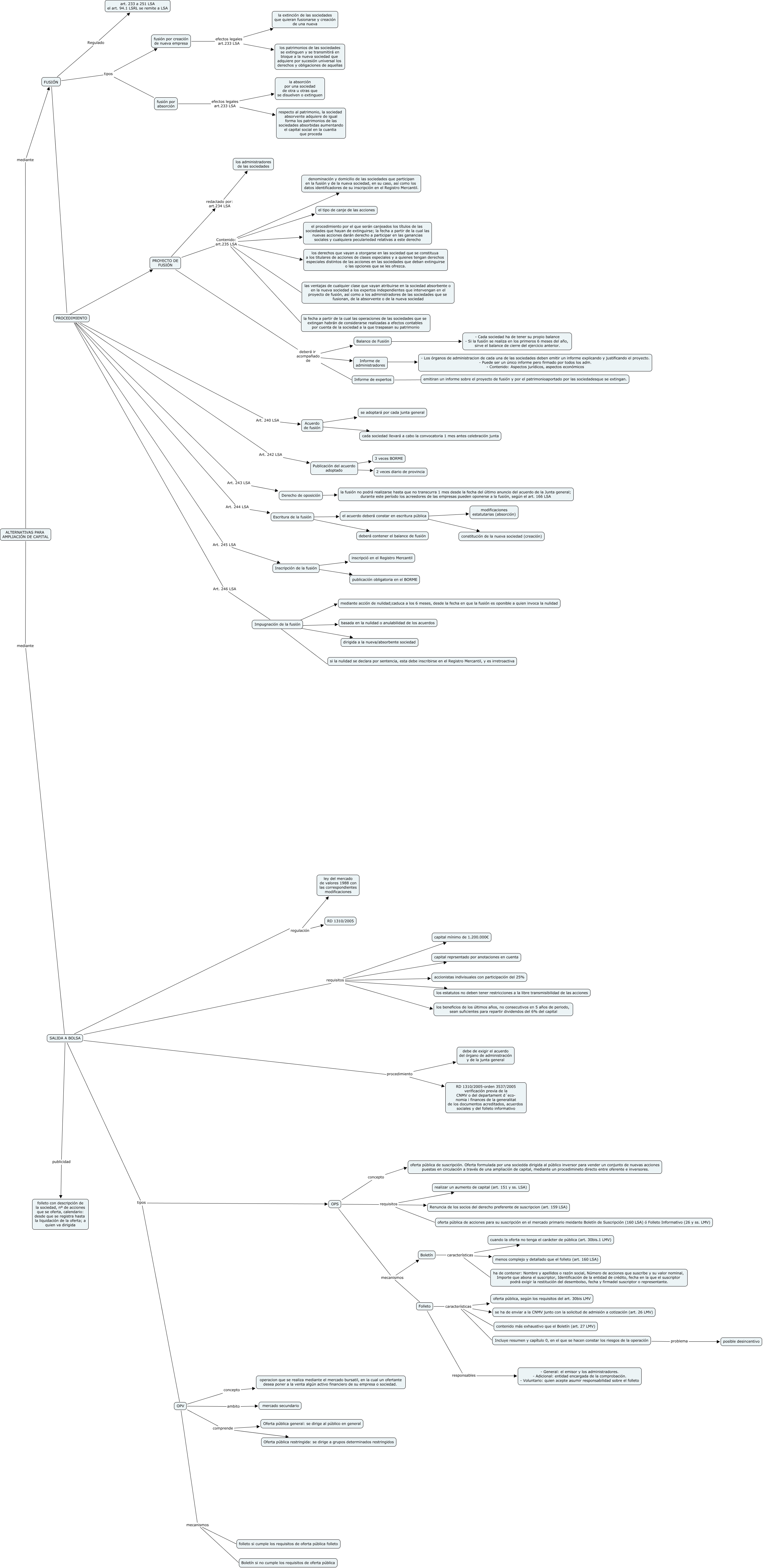 Este Cmap, tiene información relacionada con: CMap 9, OPV concepto operacion que se realiza mediante el mercado bursatil, en la cual un ofertante desea poner a la venta algún activo financiero de su empresa o sociedad., fusión por absorción efectos legales art.233 LSA la absorción por una sociedad de otra u otras que se disuelven o extinguen, Impugnación de la fusión ???? basada en la nulidad o anulabilidad de los acuerdos, FUSIÓN tipos fusión por absorción, PROCEDIMIENTO Art. 242 LSA Publicación del acuerdo adoptado, SALIDA A BOLSA requisitos accionistas indivisuales con participación del 25%, PROCEDIMIENTO Art. 240 LSA Acuerdo de fusión, Inscripción de la fusión ???? publicación obligatoria en el BORME, Publicación del acuerdo adoptado ???? 2 veces diario de provincia, Escritura de la fusión ???? deberá contener el balance de fusión, OPV mecanismos folleto si cumple los requisitos de oferta pública folleto, SALIDA A BOLSA tipos OPS, OPS mecanismos Folleto, SALIDA A BOLSA requisitos los beneficios de los últimos años, no consecutivos en 5 años de periodo, sean suficientes para repartir dividendos del 6% del capital, Folleto características se ha de enviar a la CNMV junto con la solicitud de admisión a cotización (art. 26 LMV), PROCEDIMIENTO Art. 244 LSA Escritura de la fusión, el acuerdo deberá constar en escritura pública ???? modificaciones estatutarias (absorción), Derecho de oposición ???? la fusión no podrá realizarse hasta que no transcurra 1 mes desde la fecha del último anuncio del acuerdo de la Junta general; durante este período los acreedores de las empresas pueden oponerse a la fusión, según el art. 166 LSA, PROCEDIMIENTO Art. 245 LSA Inscripción de la fusión, Impugnación de la fusión ???? si la nulidad se declara por sentencia, esta debe inscribirse en el Registro Mercantil, y es irretroactiva