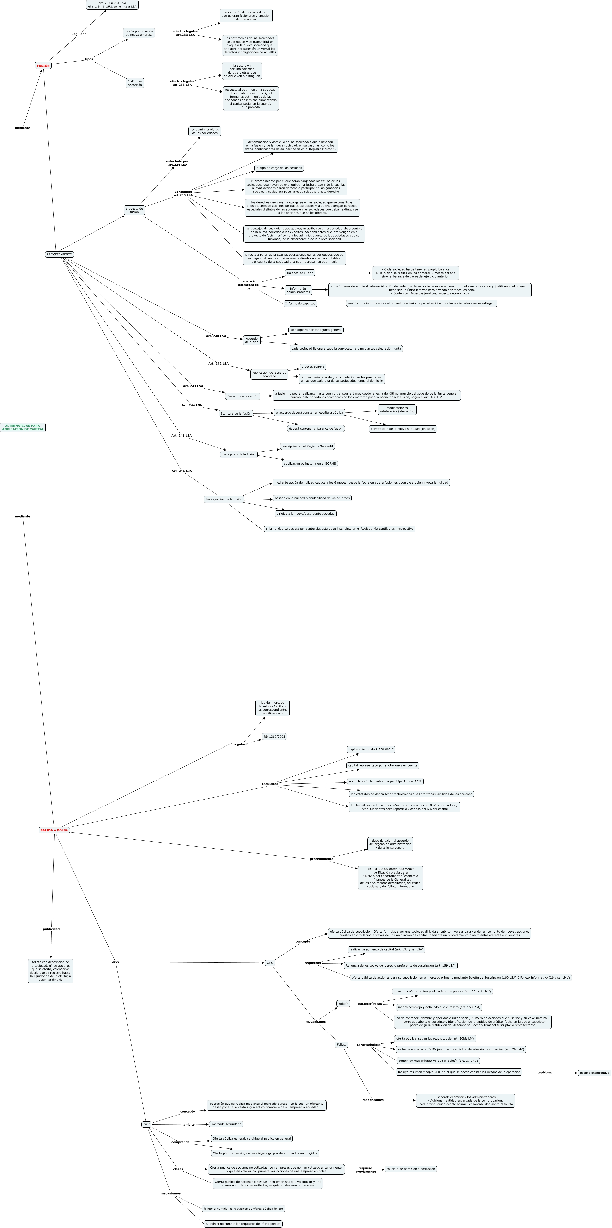 Este Cmap, tiene información relacionada con: CMap 9 modificat, OPV concepto operación que se realiza mediante el mercado bursátil, en la cual un ofertante desea poner a la venta algún activo financiero de su empresa o sociedad., fusión por absorción efectos legales art.233 LSA la absorción por una sociedad de otra u otras que se disuelven o extinguen, OPV clases Oferta pública de acciones cotizadas: son empresas que ya cotizan y uno o más accionistas mayoritarios, se quieren desprender de ellas., Impugnación de la fusión ???? basada en la nulidad o anulabilidad de los acuerdos, SALIDA A BOLSA requisitos accionistas individuales con participación del 25%, PROCEDIMIENTO Art. 242 LSA Publicación del acuerdo adoptado, FUSIÓN tipos fusión por absorción, Inscripción de la fusión ???? publicación obligatoria en el BORME, PROCEDIMIENTO Art. 240 LSA Acuerdo de fusión, Publicación del acuerdo adoptado ???? en dos periódicos de gran circulación en las provincias en las que cada una de las sociedades tenga el domicilio, Escritura de la fusión ???? deberá contener el balance de fusión, SALIDA A BOLSA tipos OPS, OPV mecanismos folleto si cumple los requisitos de oferta pública folleto, SALIDA A BOLSA requisitos los beneficios de los últimos años, no consecutivos en 5 años de periodo, sean suficientes para repartir dividendos del 6% del capital, OPS mecanismos Folleto, PROCEDIMIENTO Art. 244 LSA Escritura de la fusión, Folleto características se ha de enviar a la CNMV junto con la solicitud de admisión a cotización (art. 26 LMV), Derecho de oposición ???? la fusión no podrá realizarse hasta que no transcurra 1 mes desde la fecha del último anuncio del acuerdo de la Junta general; durante este período los acreedores de las empresas pueden oponerse a la fusión, según el art. 166 LSA, el acuerdo deberá constar en escritura pública ???? modificaciones estatutarias (absorción), SALIDA A BOLSA tipos OPV