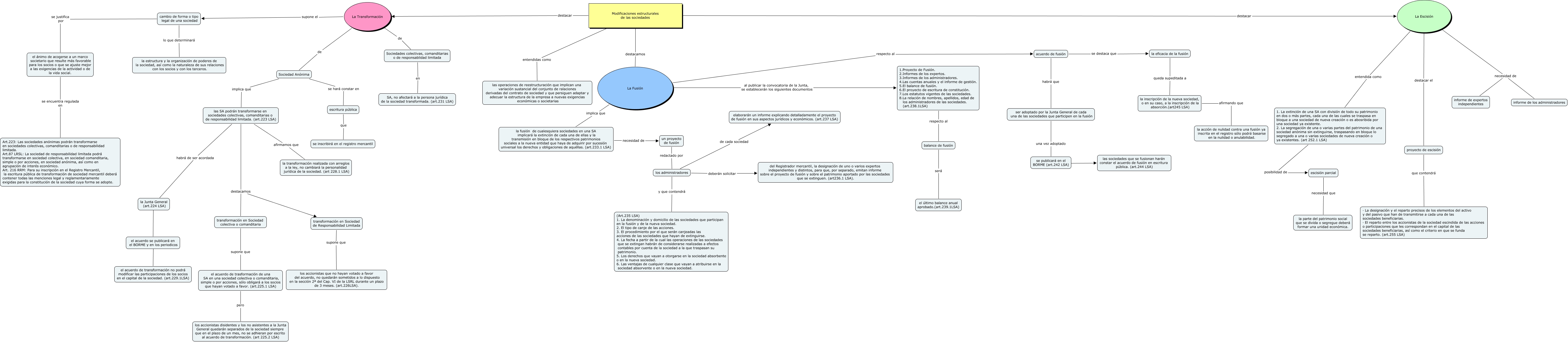 Este mapa conceptual tiene información relacionada a: caso9merca2, La Escisión necesidad de informe de los administradores, los administradores de cada sociedad elaborarán un informe explicando detalladamente el proyecto de fusión en sus aspectos jurídicos y económicos. (art.237 LSA), transformación en Sociedad de Responsabilidad Limitada supone que los accionistas que no hayan votado a favor del acuerdo, no quedarán sometidos a lo dispuesto en la sección 2ª del Cap. VI de la LSRL durante un plazo de 3 meses. (art.226LSA)., Sociedad Anónima se hará constar en escritura pública, la inscripción de la nueva sociedad, o en su caso, a la inscripción de la absorción.(art245 LSA) afirmando que la acción de nulidad contra una fusión ya inscrita en el registro sólo podrá basarse en la nulidad o anulabilidad., Modificaciones estructurales de las sociedades entendidas como las operaciones de reestructuración que implican una variación sustancial del conjunto de ralaciones derivadas del contrato de sociedad y que persiguen adaptar y adecuar la estructura de la empresa a nuevas exigencias económicas o societarias, cambio de forma o tipo legal de una sociedad lo que determinará la estructura y la organización de poderes de la sociedad, así como la naturaleza de sus relaciones con los socios y con los terceros., 1. La extinción de una SA con división de todo su patrimonio en dos o más partes, cada una de las cuales se traspasa en bloque a una sociedad de nueva creación o es abosribida por una sociedad ya existente. 2. La segregación de una o varias partes del patrimonio de una sociedad anónima sin extinguirse, traspasando en bloque lo segregado a una o varias sociedades de nueva creación o ya existentes. (art 252.1 LSA) posibilidad de escisión parcial, Sociedad Anónima implica que las SA podrán transformarse en sociedades colectivas, comanditarias o de responsabilidad limitada. (art.223 LSA), ser adoptado por la Junta General de cada una de las sociedades que participen en la fusión una vez adoptado se publicará en el BORME (art.242 LSA)