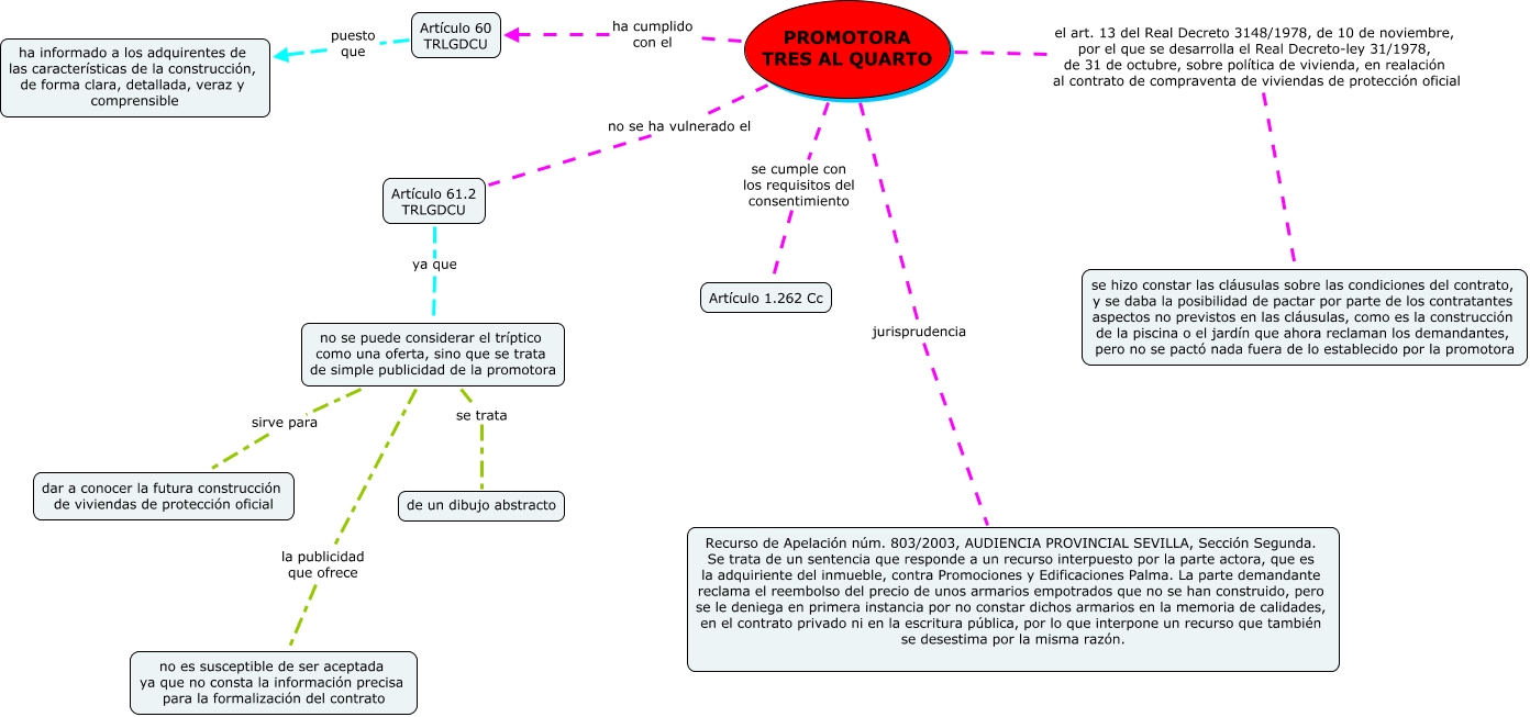 Este Cmap, tiene información relacionada con: DIETARIO 5 (ANA, JORDI GARCÍA, LEÓN Y JODAR), PROMOTORA TRES AL QUARTO se cumple con los requisitos del consentimiento Artículo 1.262 Cc, Artículo 60 TRLGDCU puesto que ha informado a los adquirentes de las características de la construcción, de forma clara, detallada, veraz y comprensible, Artículo 61.2 TRLGDCU ya que no se puede considerar el tríptico como una oferta, sino que se trata de simple publicidad de la promotora, no se puede considerar el tríptico como una oferta, sino que se trata de simple publicidad de la promotora se trata de un dibujo abstracto, PROMOTORA TRES AL QUARTO ha cumplido con el Artículo 60 TRLGDCU, no se puede considerar el tríptico como una oferta, sino que se trata de simple publicidad de la promotora la publicidad que ofrece no es susceptible de ser aceptada ya que no consta la información precisa para la formalización del contrato, PROMOTORA TRES AL QUARTO el art. 13 del Real Decreto 3148/1978, de 10 de noviembre, por el que se desarrolla el Real Decreto-ley 31/1978, de 31 de octubre, sobre política de vivienda, en realación al contrato de compraventa de viviendas de protección oficial se hizo constar las cláusulas sobre las condiciones del contrato, y se daba la posibilidad de pactar por parte de los contratantes aspectos no previstos en las cláusulas, como es la construcción de la piscina o el jardín que ahora reclaman los demandantes, pero no se pactó nada fuera de lo establecido por la promotora, no se puede considerar el tríptico como una oferta, sino que se trata de simple publicidad de la promotora sirve para dar a conocer la futura construcción de viviendas de protección oficial, PROMOTORA TRES AL QUARTO no se ha vulnerado el Artículo 61.2 TRLGDCU, PROMOTORA TRES AL QUARTO jurisprudencia Recurso de Apelación núm. 803/2003, AUDIENCIA PROVINCIAL SEVILLA, Sección Segunda. Se trata de un sentencia que responde a un recurso interpuesto por la parte actora, que es la adquiriente del inmueble, contra Promociones y Edificaciones Palma. La parte demandante reclama el reembolso del precio de unos armarios empotrados que no se han construido, pero se le deniega en primera instancia por no constar dichos armarios en la memoria de calidades, en el contrato privado ni en la escritura pública, por lo que interpone un recurso que también se desestima por la misma razón.