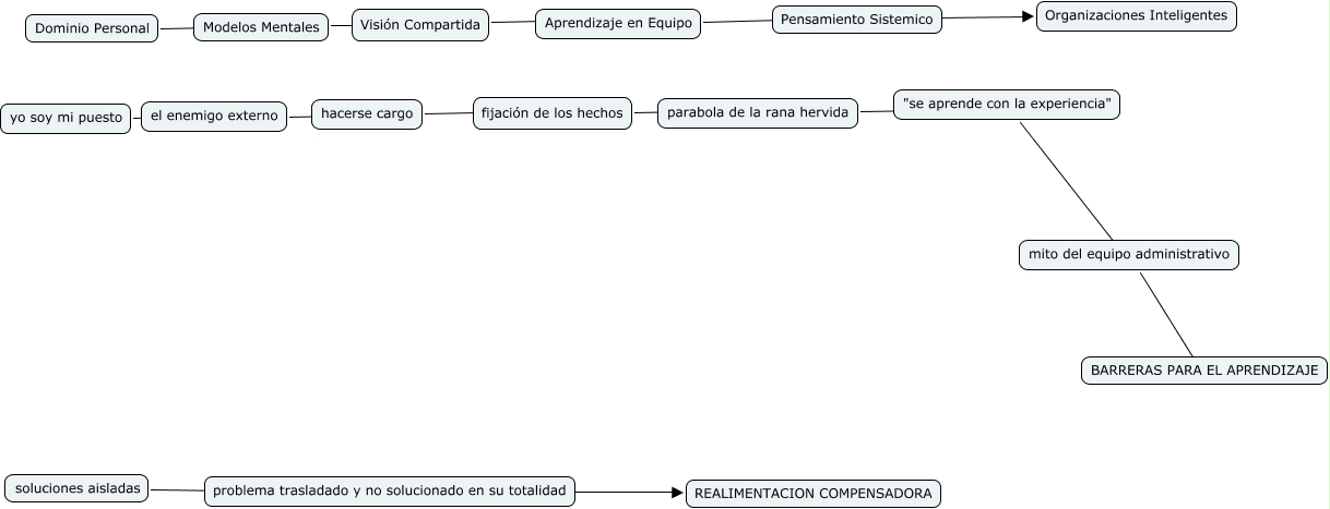 This Concept Map, created with IHMC CmapTools, has information related to: Quinta C1,2,4, Aprendizaje en Equipo ???? Pensamiento Sistemico, el enemigo externo ???? hacerse cargo, parabola de la rana hervida ???? "se aprende con la experiencia", "se aprende con la experiencia" ???? mito del equipo administrativo, mito del equipo administrativo ???? BARRERAS PARA EL APRENDIZAJE, Modelos Mentales ???? Visión Compartida, soluciones aisladas ???? problema trasladado y no solucionado en su totalidad, Dominio Personal ???? Modelos Mentales, yo soy mi puesto ???? el enemigo externo, Visión Compartida ???? Aprendizaje en Equipo, hacerse cargo ???? fijación de los hechos, fijación de los hechos ???? parabola de la rana hervida, Pensamiento Sistemico ???? Organizaciones Inteligentes, soluciones aisladas ???? REALIMENTACION COMPENSADORA