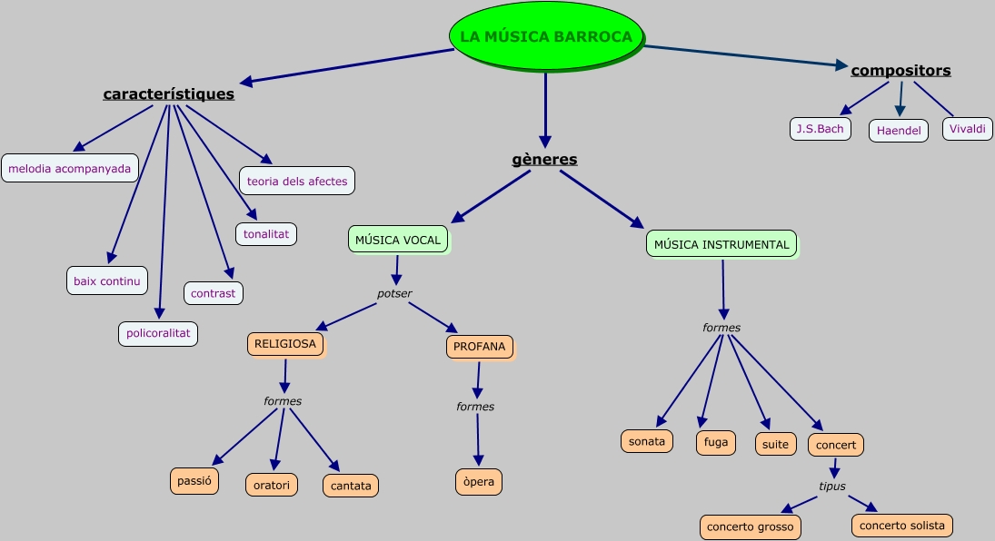 Este Cmap, tiene información relacionada con: MÚSICA BARROCA2, LA MÚSICA BARROCA característiques melodia acompanyada, LA MÚSICA BARROCA gèneres MÚSICA VOCAL, RELIGIOSA formes cantata, LA MÚSICA BARROCA característiques contrast, LA MÚSICA BARROCA característiques policoralitat, RELIGIOSA formes oratori, LA MÚSICA BARROCA gèneres MÚSICA INSTRUMENTAL, LA MÚSICA BARROCA característiques baix continu, MÚSICA INSTRUMENTAL formes suite, MÚSICA INSTRUMENTAL formes sonata, MÚSICA INSTRUMENTAL formes fuga, PROFANA formes òpera, LA MÚSICA BARROCA compositors J.S.Bach, MÚSICA VOCAL potser RELIGIOSA, concert tipus concerto solista, RELIGIOSA formes passió, concert tipus concerto grosso, LA MÚSICA BARROCA compositors Haendel, LA MÚSICA BARROCA característiques teoria dels afectes, MÚSICA VOCAL potser PROFANA