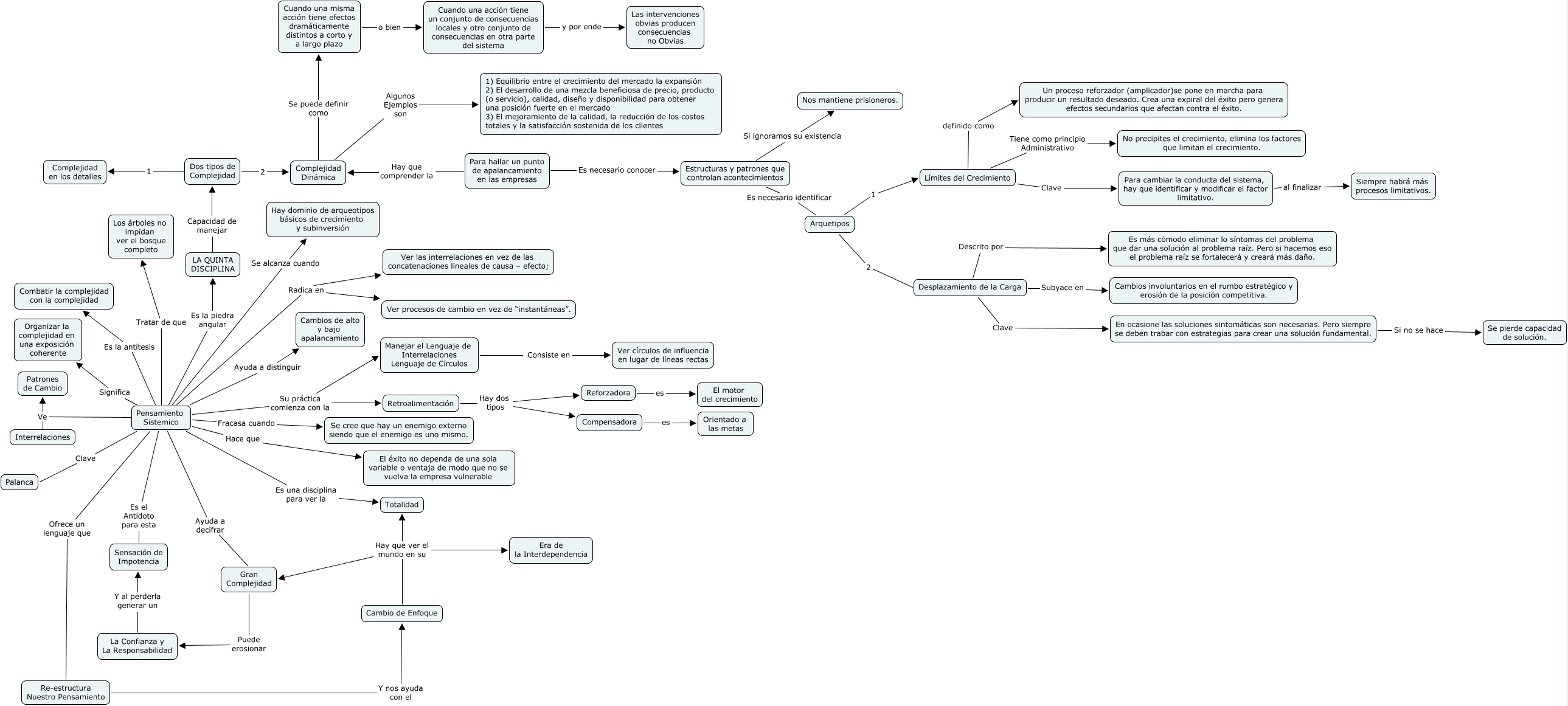 Este Cmap, tiene información relacionada con: Tarea Clase 3, Desplazamiento de la Carga Subyace en Cambios involuntarios en el rumbo estratégico y erosión de la posición competitiva., Cuando una acción tiene un conjunto de consecuencias locales y otro conjunto de consecuencias en otra parte del sistema y por ende Las intervenciones obvias producen consecuencias no Obvias, Pensamiento Sistemico Su práctica comienza con la Manejar el Lenguaje de Interrelaciones Lenguaje de Círculos, Límites del Crecimiento Clave Para cambiar la conducta del sistema, hay que identificar y modificar el factor limitativo., Pensamiento Sistemico Se alcanza cuando Hay dominio de arqueotipos básicos de crecimiento y subinversión, Arquetipos 1 Límites del Crecimiento, Para hallar un punto de apalancamiento en las empresas Hay que comprender la Complejidad Dinámica, Dos tipos de Complejidad 2 Complejidad Dinámica, Pensamiento Sistemico Significa Organizar la complejidad en una exposición coherente, Pensamiento Sistemico Hace que El éxito no dependa de una sola variable o ventaja de modo que no se vuelva la empresa vulnerable, Arquetipos 2 Desplazamiento de la Carga, Estructuras y patrones que controlan acontecimientos Si ignoramos su existencia Nos mantiene prisioneros., Pensamiento Sistemico Radica en Ver procesos de cambio en vez de “instantáneas”., Pensamiento Sistemico Ve Interrelaciones, Pensamiento Sistemico Es el Antídoto para esta Sensación de Impotencia, LA QUINTA DISCIPLINA Capacidad de manejar Dos tipos de Complejidad, Pensamiento Sistemico Es la piedra angular LA QUINTA DISCIPLINA, Pensamiento Sistemico Clave Palanca, Desplazamiento de la Carga Clave En ocasione las soluciones sintomáticas son necesarias. Pero siempre se deben trabar con estrategias para crear una solución fundamental., Estructuras y patrones que controlan acontecimientos Es necesario identificar Arquetipos