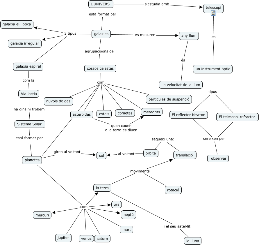 Este mapa conceptual tiene información relacionada a: l'univers_Judith, Cristina P i Fabio, galaxies es mesuren any llum, la terra moviments rotació, planetes com neptú, nuvols de gas com meteorits, L'UNIVERS està format per galaxies, la terra moviments translació, cossos celestes com meteorits, El telescopi refractor sereixen per observar, planetes giren al voltant sol, galaxies 3 tipus galaxia el·liptica, particules de suspenció com cometes, particules de suspenció com asteroides, planetes com la terra, un instrument óptic tipus El telescopi refractor, planetes com mart, un instrument óptic tipus El reflector Newton, El reflector Newton sereixen per observar, L'UNIVERS s'estudia amb telescopi, particules de suspenció com planetes, translació segueix una: orbita