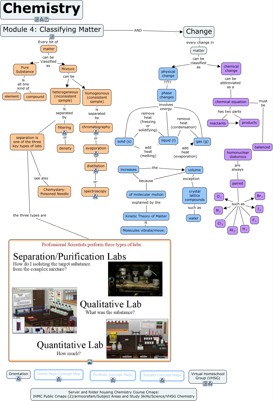 This Concept Map, created with IHMC CmapTools, has information related to: Apologia, ed 1, Module 4 Concept Map, Module 4: Classifying Matter AND Change, evaporation or distillation, paired such as <math xmlns="http://www.w3.org/1998/Math/MathML"> <mrow> <mmultiscripts> <mtext> Cl </mtext> <mtext> 2 </mtext> <none/> </mmultiscripts> </mrow> </math>, liquid (l) add heat (evaporation) gas (g), paired such as <math xmlns="http://www.w3.org/1998/Math/MathML"> <mrow> <mmultiscripts> <mtext> At </mtext> <mtext> 2 </mtext> <none/> </mmultiscripts> </mrow> </math>, volume because of molecular motion, matter can be classified as physical change, phase changes involves energy liquid (l), paired such as <math xmlns="http://www.w3.org/1998/Math/MathML"> <mrow> <mmultiscripts> <mtext> O </mtext> <mtext> 2 </mtext> <none/> </mmultiscripts> </mrow> </math>, homogeonous (consisitent sample) is separated by chromatography, separation is one of the three key types of labs see also Chemystery: Poisoned Needle, gas (g) remove heat (condensation) liquid (l), physical change ???? phase changes, Mixture can be heterogeneous (inconsistent sample), paired such as <math xmlns="http://www.w3.org/1998/Math/MathML"> <mrow> <mmultiscripts> <mtext> I </mtext> <mtext> 2 </mtext> <none/> </mmultiscripts> </mrow> </math>, phase changes involves energy solid (s), matter can be 'classified as Mixture, solid (s) add heat (melting) liquid (l), liquid (l) remove heat (freezing or solidifying) solid (s), increases because of molecular motion