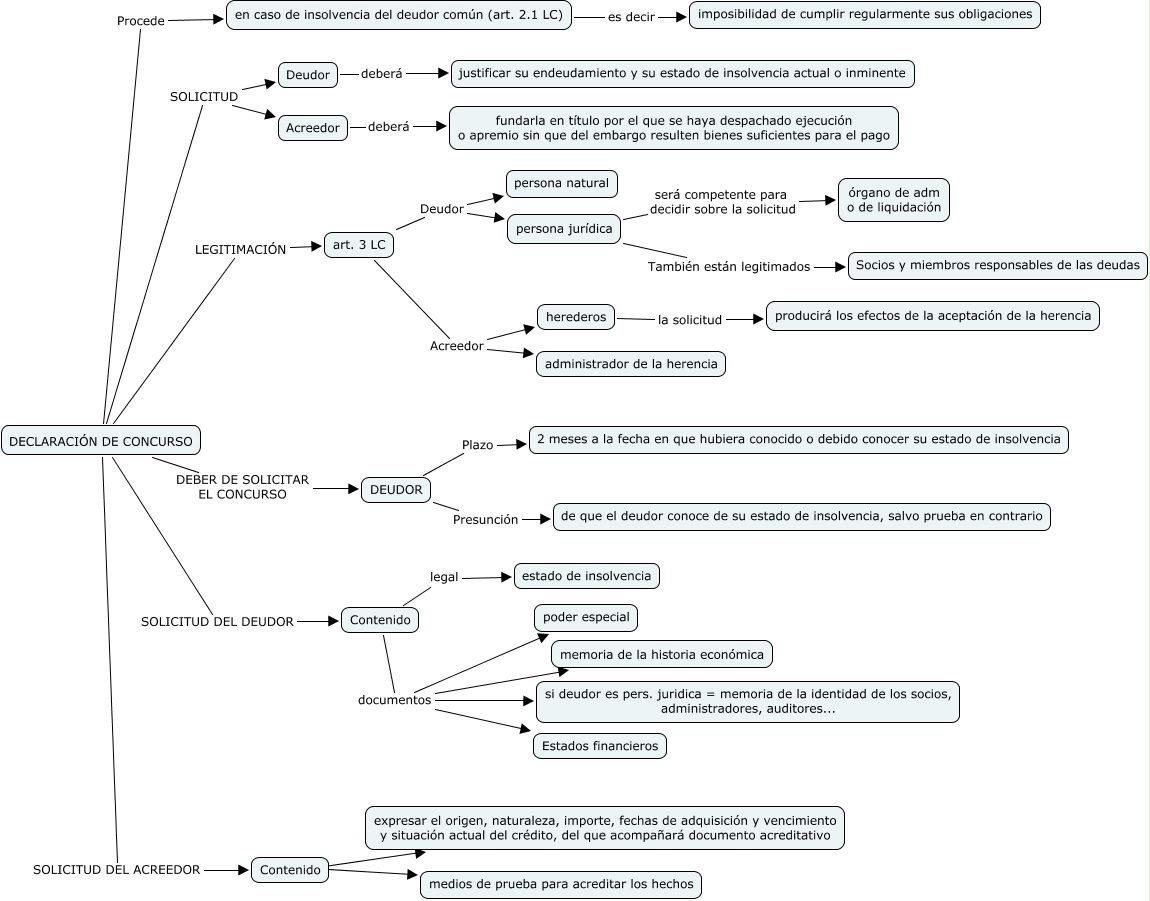 Este Cmap, tiene información relacionada con: Solicitud de CONCURSO, art. 3 LC Deudor persona jurídica, DECLARACIÓN DE CONCURSO DEBER DE SOLICITAR EL CONCURSO DEUDOR, Contenido ???? expresar el origen, naturaleza, importe, fechas de adquisición y vencimiento y situación actual del crédito, del que acompañará documento acreditativo, DECLARACIÓN DE CONCURSO SOLICITUD DEL DEUDOR Contenido, DECLARACIÓN DE CONCURSO SOLICITUD Acreedor, DECLARACIÓN DE CONCURSO LEGITIMACIÓN art. 3 LC, Contenido documentos si deudor es pers. juridica = memoria de la identidad de los socios, administradores, auditores..., art. 3 LC Deudor persona natural, art. 3 LC Acreedor administrador de la herencia, DECLARACIÓN DE CONCURSO SOLICITUD DEL ACREEDOR Contenido, Deudor deberá justificar su endeudamiento y su estado de insolvencia actual o inminente, persona jurídica También están legitimados Socios y miembros responsables de las deudas, Contenido documentos memoria de la historia económica, DECLARACIÓN DE CONCURSO Procede en caso de insolvencia del deudor común (art. 2.1 LC), DECLARACIÓN DE CONCURSO SOLICITUD Deudor, herederos la solicitud producirá los efectos de la aceptación de la herencia, Contenido documentos poder especial, Acreedor deberá fundarla en título por el que se haya despachado ejecución o apremio sin que del embargo resulten bienes suficientes para el pago, Contenido legal estado de insolvencia, persona jurídica será competente para decidir sobre la solicitud órgano de adm o de liquidación