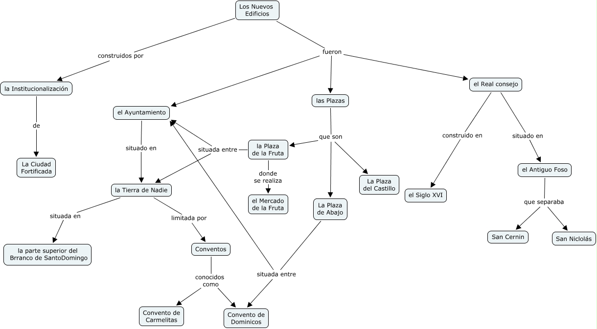 nuevos edificios, Conventos conocidos como Convento de Carmelitas, Los Nuevos Edificios fueron las Plazas, el Antiguo Foso que separaba San Cernin, Los Nuevos Edificios fueron el Ayuntamiento, la Institucionalización de La Ciudad Fortificada, Los Nuevos Edificios fueron el Real consejo, la Tierra de Nadie situada en la parte superior del Brranco de SantoDomingo, el Real consejo situado en el Antiguo Foso, la Tierra de Nadie limitada por Conventos, el Ayuntamiento situado en la Tierra de Nadie