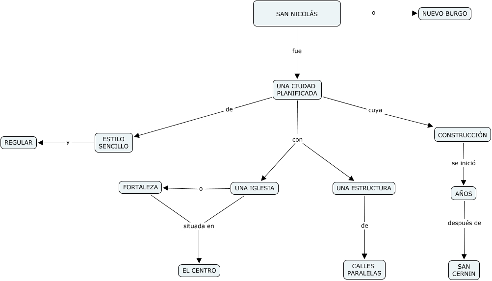 SAN NICOLAS, UNA IGLESIA o FORTALEZA, FORTALEZA situada en EL CENTRO, UNA CIUDAD PLANIFICADA con UNA IGLESIA, CONSTRUCCIÓN se inició AÑOS, UNA CIUDAD PLANIFICADA cuya CONSTRUCCIÓN, UNA CIUDAD PLANIFICADA con UNA ESTRUCTURA, UNA ESTRUCTURA de CALLES PARALELAS, SAN NICOLÁS fue UNA CIUDAD PLANIFICADA, AÑOS después de SAN CERNIN, UNA CIUDAD PLANIFICADA de ESTILO SENCILLO