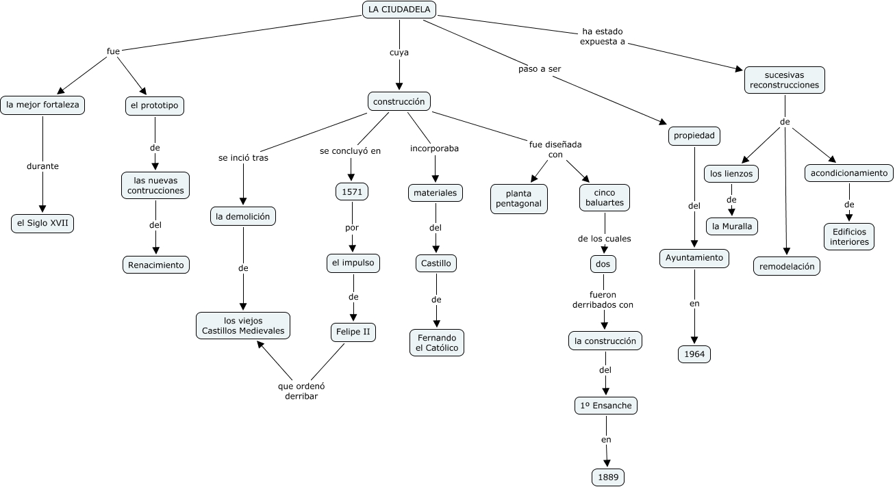 la ciudadela, construcción incorporaba materiales, 1º Ensanche en 1889, LA CIUDADELA ha estado expuesta a sucesivas reconstrucciones, sucesivas reconstrucciones de remodelación, construcción se concluyó en 1571, la mejor fortaleza durante el Siglo XVII, LA CIUDADELA fue el prototipo, LA CIUDADELA paso a ser propiedad, construcción fue diseñada con cinco baluartes, el prototipo de las nuevas contrucciones
