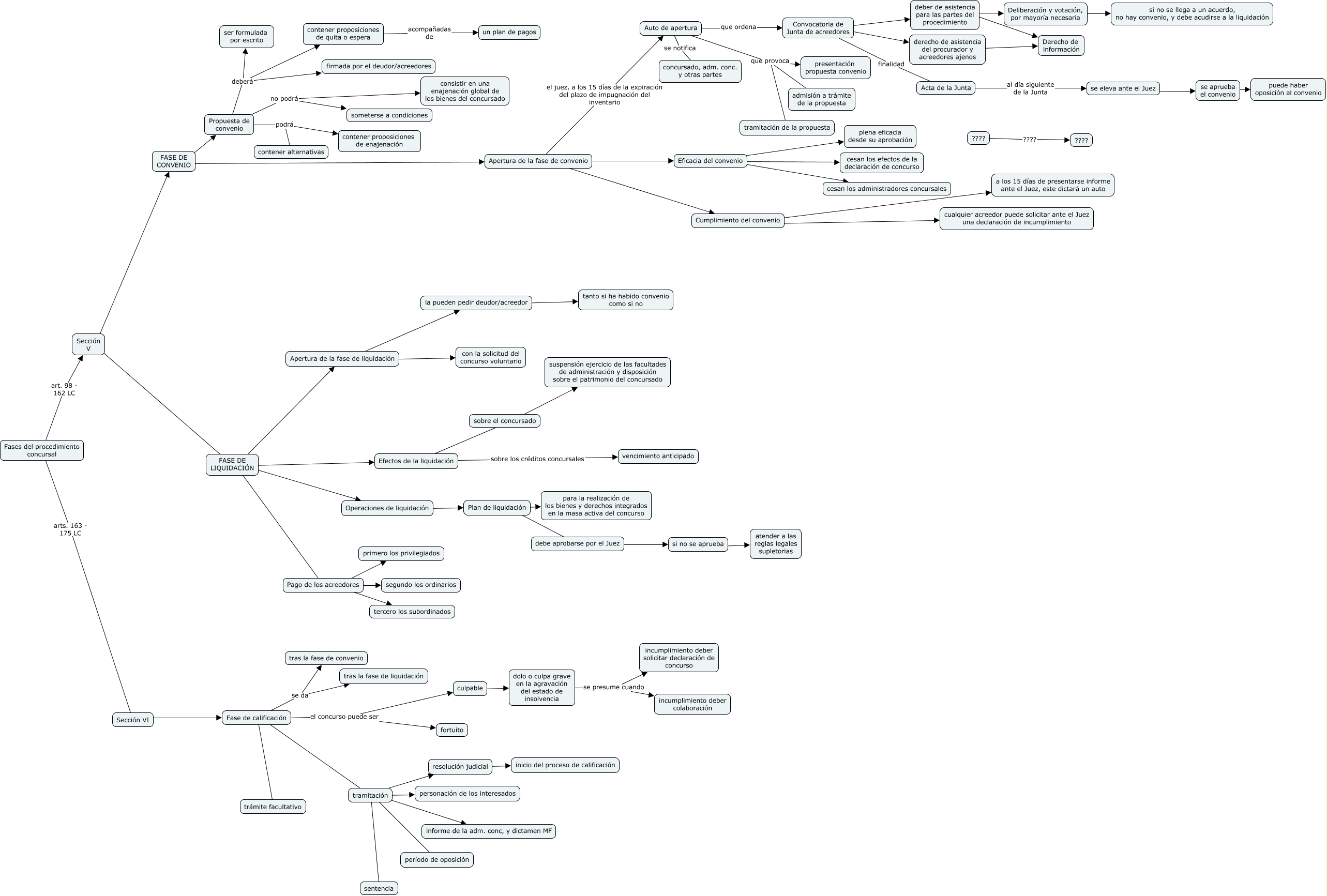 Este Cmap, tiene información relacionada con: fases de convenio, liquidación y calificación (mapa 10), FASE DE CONVENIO ???? Apertura de la fase de convenio, Plan de liquidación ???? debe aprobarse por el Juez, Apertura de la fase de convenio ???? Eficacia del convenio, Propuesta de convenio no podrá consistir en una enajenación global de los bienes del concursado, FASE DE LIQUIDACIÓN ???? Pago de los acreedores, Apertura de la fase de liquidación ???? la pueden pedir deudor/acreedor, tramitación ???? resolución judicial, se aprueba el convenio ???? puede haber oposición al convenio, Cumplimiento del convenio ???? a los 15 días de presentarse informe ante el Juez, este dictará un auto, Fase de calificación se da tras la fase de convenio, Convocatoria de Junta de acreedores ???? deber de asistencia para las partes del procedimiento, Pago de los acreedores ???? segundo los ordinarios, tramitación ???? informe de la adm. conc, y dictamen MF, Propuesta de convenio deberá contener proposiciones de quita o espera, Sección VI ???? Fase de calificación, Sección V ???? FASE DE LIQUIDACIÓN, Eficacia del convenio ???? plena eficacia desde su aprobación, Operaciones de liquidación ???? Plan de liquidación, Propuesta de convenio podrá contener proposiciones de enajenación, Apertura de la fase de liquidación ???? con la solicitud del concurso voluntario