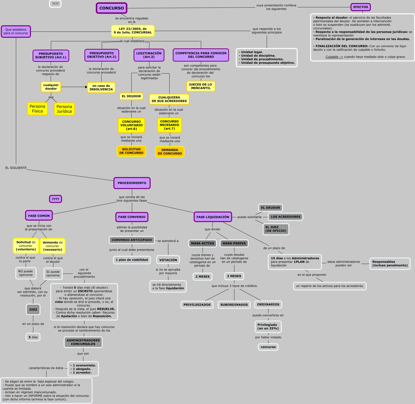 Este Cmap, tiene información relacionada con: CMAPCONCURS10, LEY 22/2003, de 9 de Julio, CONCURSAL que responde a los siguientes principios - Unidad legal. - Unidad de disciplina. - Unidad de procedimiento. - Unidad de presupuesto objetivo., CONCURSO VOLUNTARIO (art.6) que se iniciará mediante una SOLICITUD DE CONCURSO, 2 MESES que incluye 3 tipos de créditos ORDINARIOS, FASE LIQUIDACIÓN que divide MASA ACTIVA, 15 días a los Administradores para presentar 1PLAN de liquidación estos administradores pueden ser Responsables (incluso penalmente), FASE LIQUIDACIÓN puede solicitarla LOS ACREEDORES, - Tendrá 5 días más (El deudor) para emitir un ESCRITO oponiendose o allanandose al concurso. - Si hay oposición, el juez citará una vista donde se dirá si procede, o no, el concurso. - Después de la vista, el juez RESUELVE. - Contra dicha resolución caben: Recurso de Apelación o bien de Reposición. si la resolución declara que hay concurso se procede al nombramiento de los ADMINISTRADORES CONCURSALES, - 1 economista. - 1 abogado. - 1 acreedor. características de éstos - Se eligen de entre la lista especial del colegio. - Puede que se nombre a un solo administrador si la cuantía es limitada. - Actúan en régimen mancomunado. - Van a hacer un INFORME sobre la situación del concurso. (con dicho informe termina la fase común)., COMPETENCIA PARA CONOCER DEL CONCURSO son competentes para conocer del procedimiento de declaración del concurso los JUECES DE LO MERCANTIL, PROCEDIMIENTO que consta de las tres siguientes fases FASE COMÚN, NO puede oponerse que deberá ser admitido, con su resolución, por el JUEZ, demanda de concurso (necesario) contra el que el deudor SI puede oponerse, PROCEDIMIENTO que consta de las tres siguientes fases FASE CONVENIO, PRESUPUESTO OBJETIVO (Art.2) la declaración de concurso procederá en caso de INSOLVENCIA, EFECTOS ???? - Respecto al deudor: el ejercicio de las facultades patrimoniales del deudor. Se someten a intervención o bien se suspenden (se sustituyen por los administ. concursales). - Respecto a la responsabilidad de las personas jurídicas: se mantiene la representación - Paralización de la generación de intereses en las deudas. - FINALIZACIÓN DEL CONCURSO: Con un convenio de liqui- dación y con la calificación de culpable o fortuito. Culpable -> cuando haya mediado dolo o culpa grave., JUEZ en un plazo de 5 días, ORDINARIOS puede convertirse en Privilegiado (en un 25%), CONCURSO NECESARIO (art.7) que se inciará mediante una DEMANDA DE CONCURSO, FASE COMÚN que se inicia con la presentación de demanda de concurso (necesario), CONVENIO ANTICIPADO se someterá a VOTACIÓN