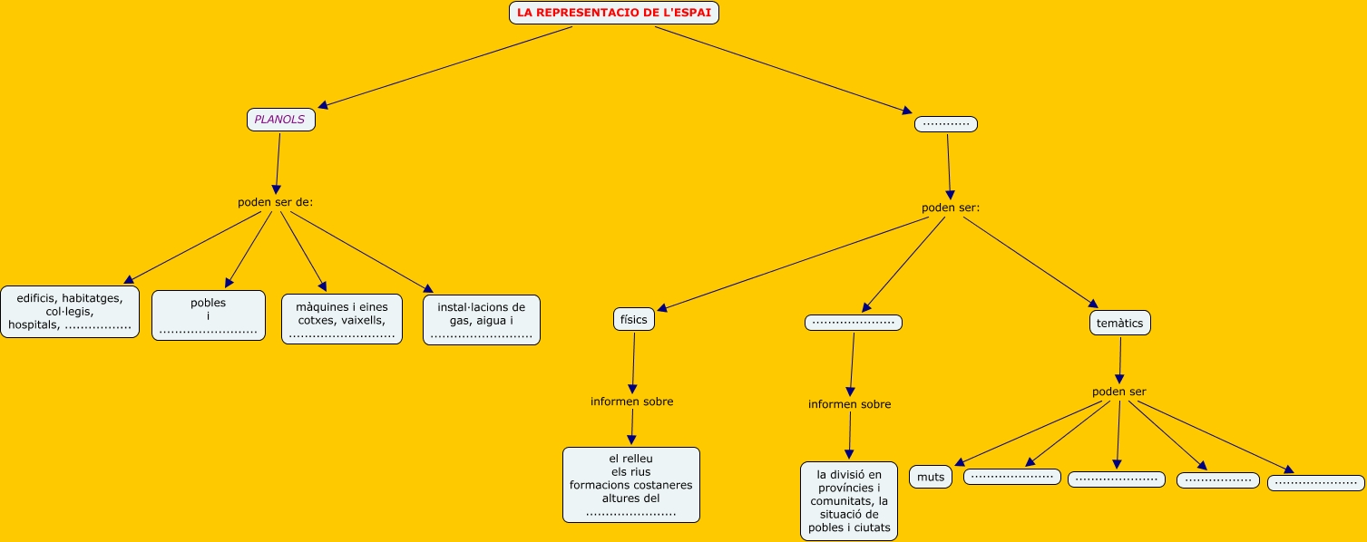 Este Cmap, tiene información relacionada con: activitats, ............ poden ser: físics, LA REPRESENTACIO DE L'ESPAI PLANOLS, PLANOLS poden ser de: edificis, habitatges, col·legis, hospitals, ................., ............ poden ser: ....................., PLANOLS poden ser de: instal·lacions de gas, aigua i .........................., ..................... informen sobre la divisió en províncies i comunitats, la situació de pobles i ciutats, temàtics poden ser ....................., temàtics poden ser ....................., PLANOLS poden ser de: màquines i eines cotxes, vaixells, ..........................., temàtics poden ser muts, PLANOLS poden ser de: pobles i ........................., físics informen sobre el relleu els rius formacions costaneres altures del ......................., temàtics poden ser ................., LA REPRESENTACIO DE L'ESPAI ............, ............ poden ser: temàtics, temàtics poden ser .....................