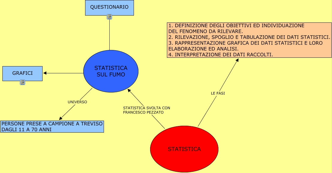 Questa Cmap, creata con IHMC CmapTools, contiene informazioni relative a: statistica sul fumo, STATISTICA SUL FUMO ???? QUESTIONARIO, STATISTICA LE FASI 1. DEFINIZIONE DEGLI OBIETTIVI ED INDIVIDUAZIONE DEL FENOMENO DA RILEVARE. 2. RILEVAZIONE, SPOGLIO E TABULAZIONE DEI DATI STATISTICI. 3. RAPPRESENTAZIONE GRAFICA DEI DATI STATISTICI E LORO ELABORAZIONE ED ANALISI. 4. INTERPRETAZIONE DEI DATI RACCOLTI., STATISTICA STATISTICA SVOLTA CON FRANCESCO PEZZATO STATISTICA SUL FUMO, STATISTICA SUL FUMO ???? GRAFICI, STATISTICA SUL FUMO UNIVERSO PERSONE PRESE A CAMPIONE A TREVISO DAGLI 11 A 70 ANNI