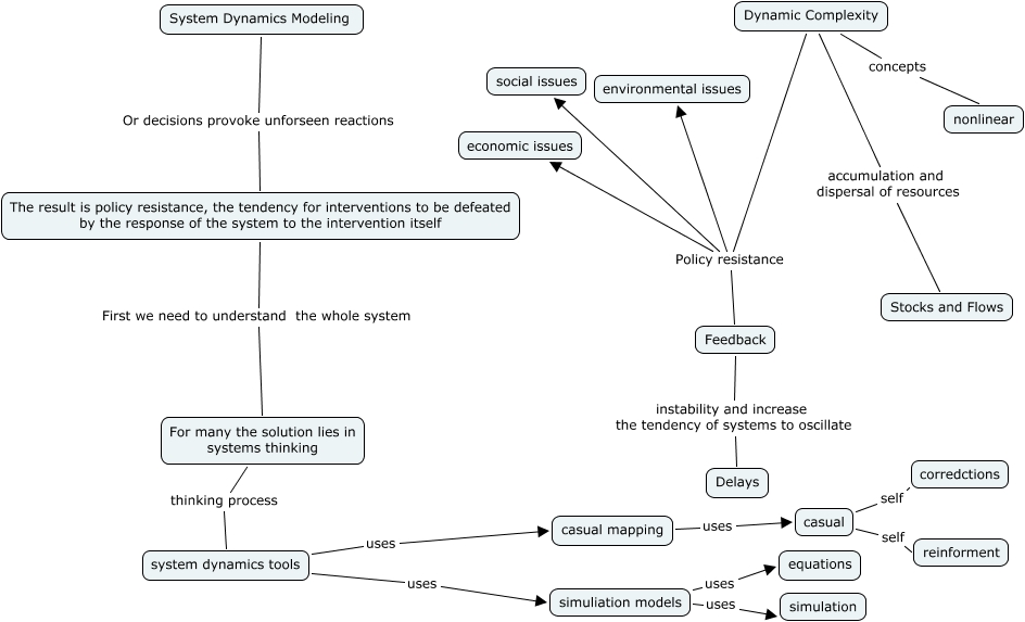 Este Cmap, tiene información relacionada con: System Dynamics Modeling, Dynamic Complexity concepts nonlinear, Dynamic Complexity Policy resistance environmental issues, Dynamic Complexity Policy resistance Feedback, system dynamics tools uses simuliation models, The result is policy resistance, the tendency for interventions to be defeated by the response of the system to the intervention itself First we need to understand the whole system For many the solution lies in systems thinking, casual self corredctions, simuliation models uses equations, casual mapping uses casual, For many the solution lies in systems thinking thinking process system dynamics tools, System Dynamics Modeling Or decisions provoke unforseen reactions The result is policy resistance, the tendency for interventions to be defeated by the response of the system to the intervention itself, system dynamics tools uses casual mapping, Dynamic Complexity accumulation and dispersal of resources Stocks and Flows, Dynamic Complexity Policy resistance economic issues, simuliation models uses simulation, casual self reinforment, Feedback instability and increase the tendency of systems to oscillate Delays, Dynamic Complexity Policy resistance social issues