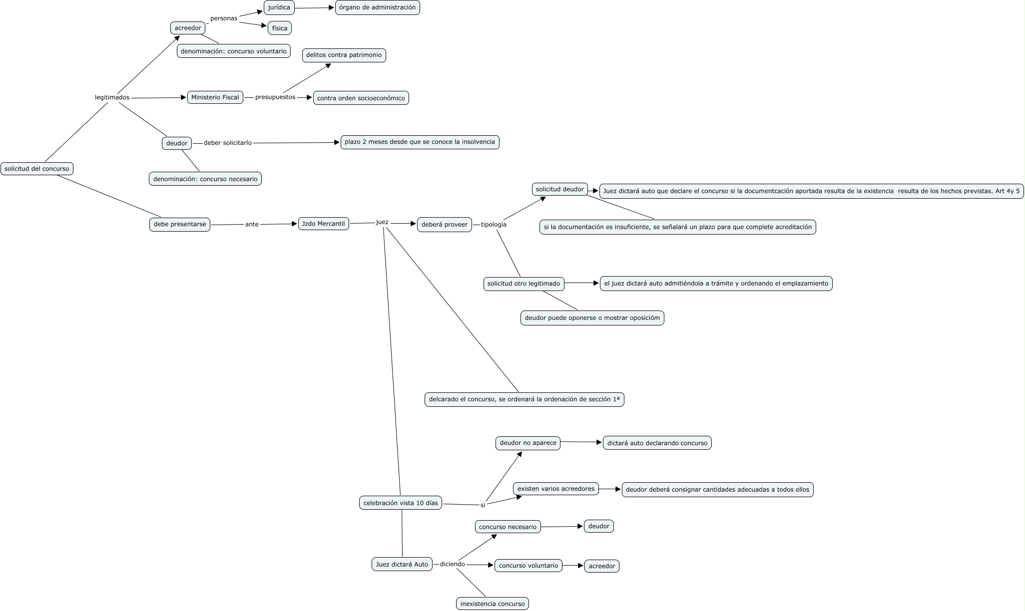 Este Cmap, tiene información relacionada con: concurso ( Mariano), deudor ???? denominación: concurso necesario, solicitud del concurso legitimados deudor, Jzdo Mercantil juez celebración vista 10 días, jurídica ???? órgano de administración, celebración vista 10 días si existen varios acreedores, solicitud del concurso ???? debe presentarse, solicitud deudor ???? si la documentación es insuficiente, se señalará un plazo para que complete acreditación, solicitud del concurso legitimados Ministerio Fiscal, Ministerio Fiscal presupuestos delitos contra patrimonio, Juez dictará Auto diciendo concurso voluntario, concurso necesario ???? deudor, Juez dictará Auto diciendo concurso necesario, deudor deber solicitarlo plazo 2 meses desde que se conoce la insolvencia, celebración vista 10 días ???? Juez dictará Auto, deudor no aparece ???? dictará auto declarando concurso, solicitud deudor ???? Juez dictará auto que declare el concurso si la documentcación aportada resulta de la existencia resulta de los hechos previstas. Art 4y 5, celebración vista 10 días si deudor no aparece, deberá proveer tipología solicitud otro legitimado, acreedor ???? denominación: concurso voluntario, solicitud del concurso legitimados acreedor