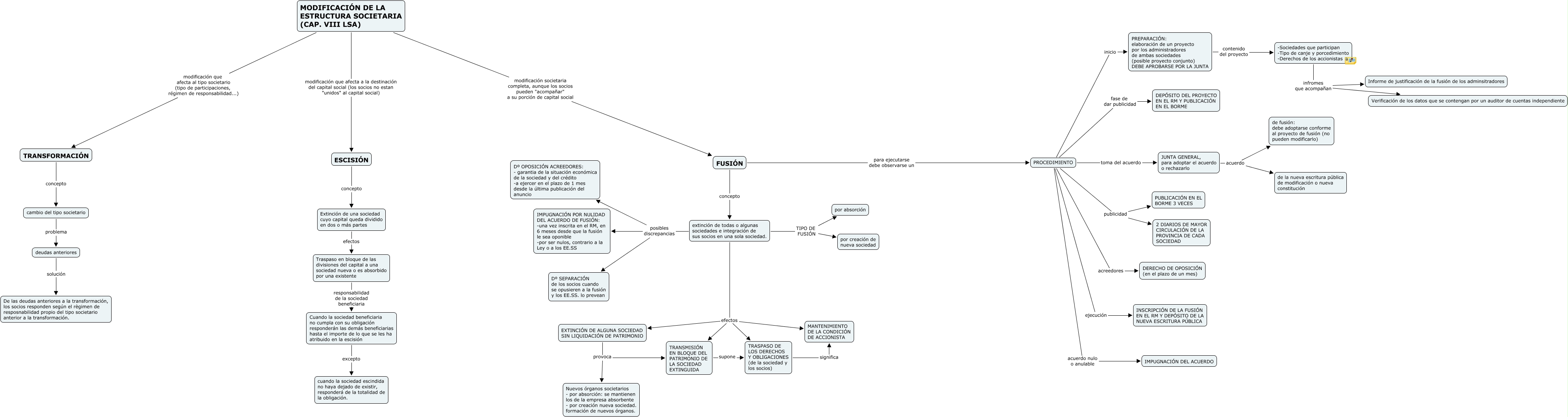 PACKMAN, PROCEDIMIENTO publicidad PUBLICACIÓN EN EL BORME 3 VECES, Traspaso en bloque de las divisiones del capital a una sociedad nueva o es absorbido por una existente responsabilidad de la sociedad beneficiaria Cuando la sociedad beneficiaria no cumpla con su obligación responderán las demás beneficiarias hasta el importe de lo que se les ha atribuido en la escisión, ESCISIÓN concepto Extinción de una sociedad cuyo capital queda dividido en dos o más partes, JUNTA GENERAL, para adoptar el acuerdo o rechazarlo acuerdo de la nueva escritura pública de modificación o nueva constitución, -Sociedades que participan -Tipo de canje y porcedimiento -Derechos de los accionistas infromes que acompañan Informe de justificación de la fusión de los adminsitradores, TRANSFORMACIÓN concepto cambio del tipo societario, FUSIÓN concepto extinción de todas o algunas sociedades e integración de sus socios en una sola sociedad., JUNTA GENERAL, para adoptar el acuerdo o rechazarlo acuerdo de fusión: debe adoptarse conforme al proyecto de fusión (no pueden modificarlo), extinción de todas o algunas sociedades e integración de sus socios en una sola sociedad. efectos MANTENIMIENTO DE LA CONDICIÓN DE ACCIONISTA, PROCEDIMIENTO fase de dar publicidad DEPÓSITO DEL PROYECTO EN EL RM Y PUBLICACIÓN EN EL BORME