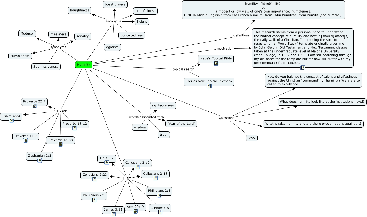 This Concept Map has information related to: Word Study on Humility, Humility antonyms egotism, Humility synonyms meekness, Humility Questions What is false humilty and are there proclamations against it?, Humility antonyms haughtiness, Humility in NT Phillipians 2:3, Humility words associated with "fear of the Lord", Humility in TANAK Proverbs 15:33, Humility definitions humility |(h)yoōˈmilitē| noun a modest or low view of one's own importance; humbleness. ORIGIN Middle English : from Old French humilite, from Latin humilitas, from humilis (see humble )., Humility in TANAK Proverbs 22:4, Humility in NT Phillipians 2:1